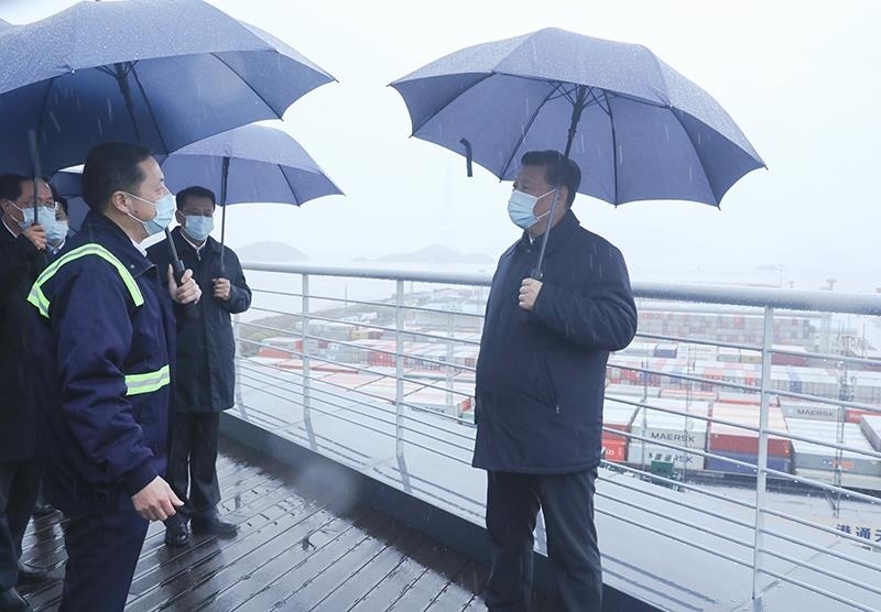 △2020年3月29日,習近平總書記在浙江寧波舟山港考察調(diào)研??疾旆稻┎蛔?0天,總書記在中央財經(jīng)委員會第七次會議上,首次提出構(gòu)建新發(fā)展格局。