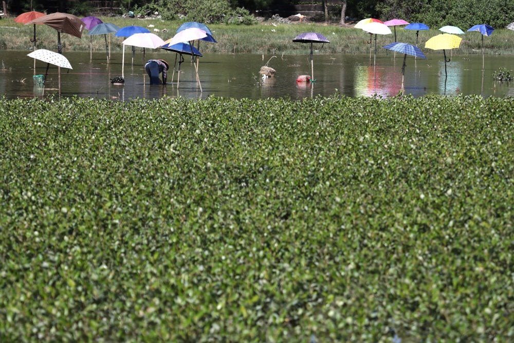 ↑村民在廣西欽州市欽南區(qū)犀牛腳鎮(zhèn)海邊的紅樹林苗圃里育苗(2021年10月3日攝)。
