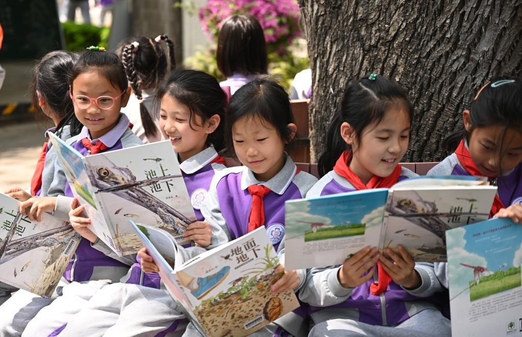 在她的校園里,有一棵“長滿書的大樹”,掛滿了《神筆馬良》《西游記》《可愛的中國》等經(jīng)典書籍。教學樓走廊里、教室里,隨處可見各種圖書。踏著閱讀的階梯,祖國的花朵茁壯成長。