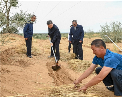 △2019年8月21日,正在甘肅考察的習(xí)近平總書記來(lái)到古浪縣八步沙林場(chǎng)。考察中,他拿起一把開溝犁,參與到治沙勞動(dòng)中。