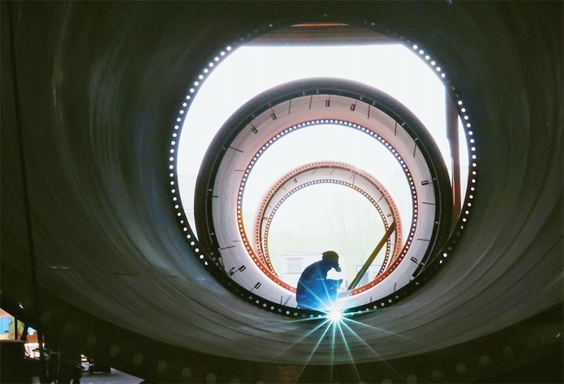 2023年一季度,我國國內生產總值同比增長4.5%,國民經濟開局良好,為實現全年發(fā)展目標奠定了基礎,注入了信心。圖為2023年4月18日,工人在江蘇連云港經濟技術開發(fā)區(qū)一家公司內加工組裝風電塔筒。 中新社發(fā) 耿玉和/攝