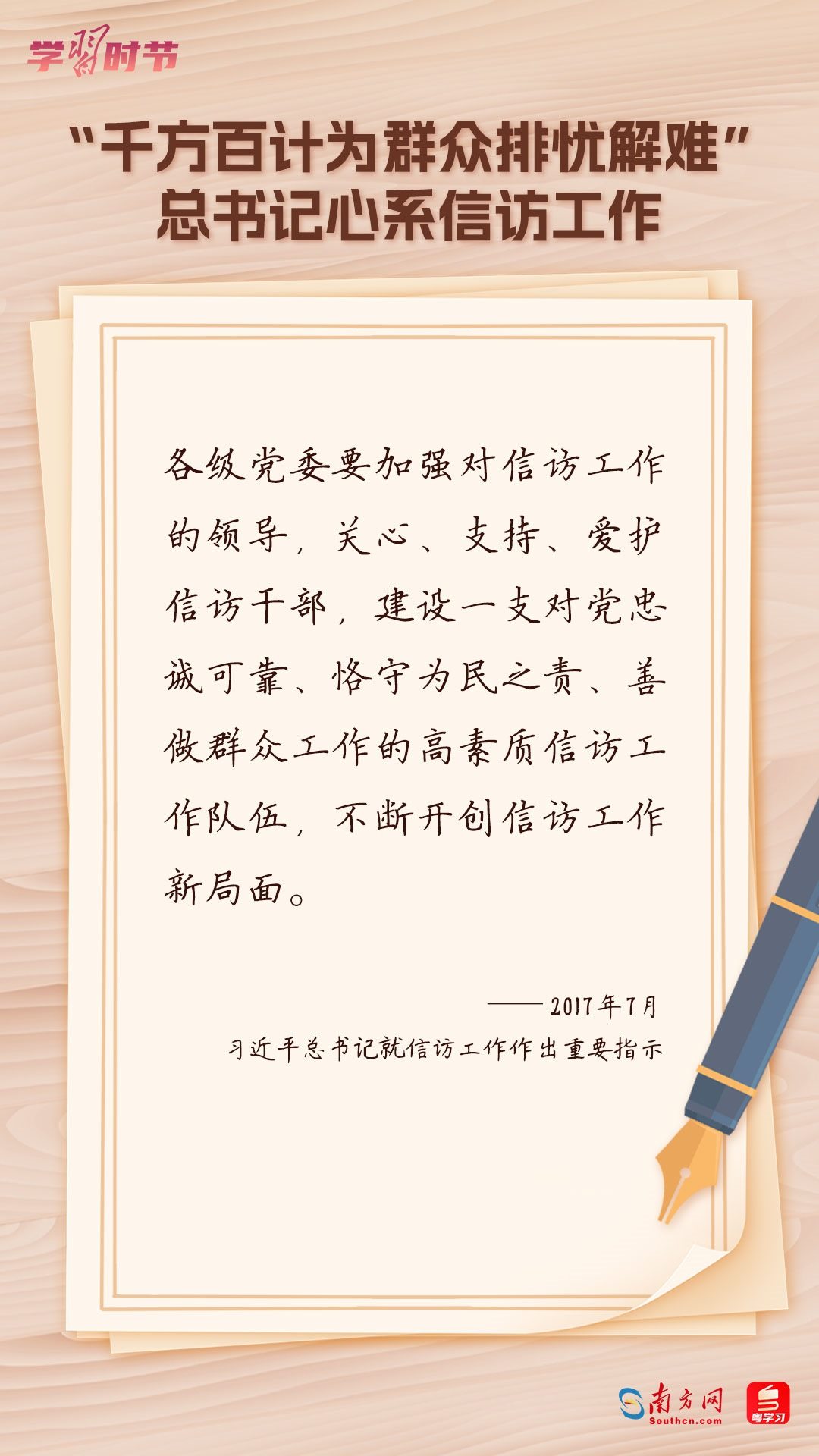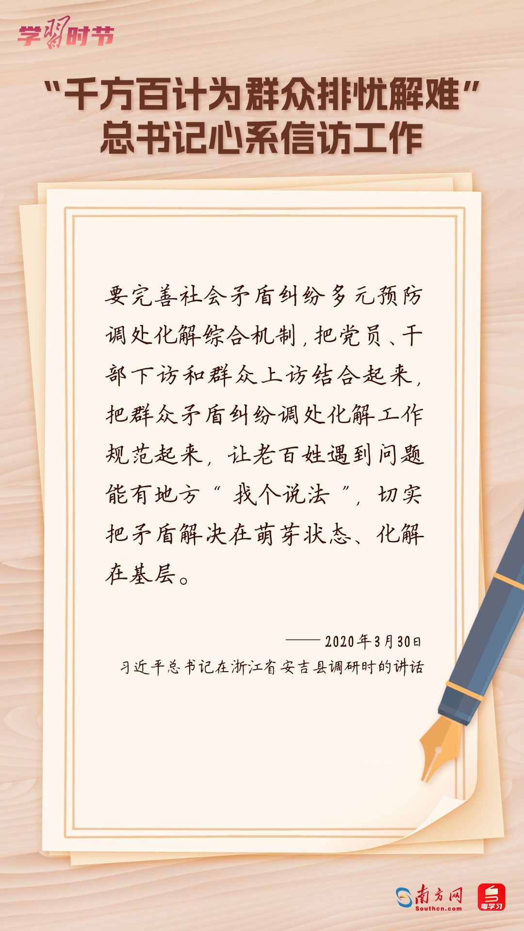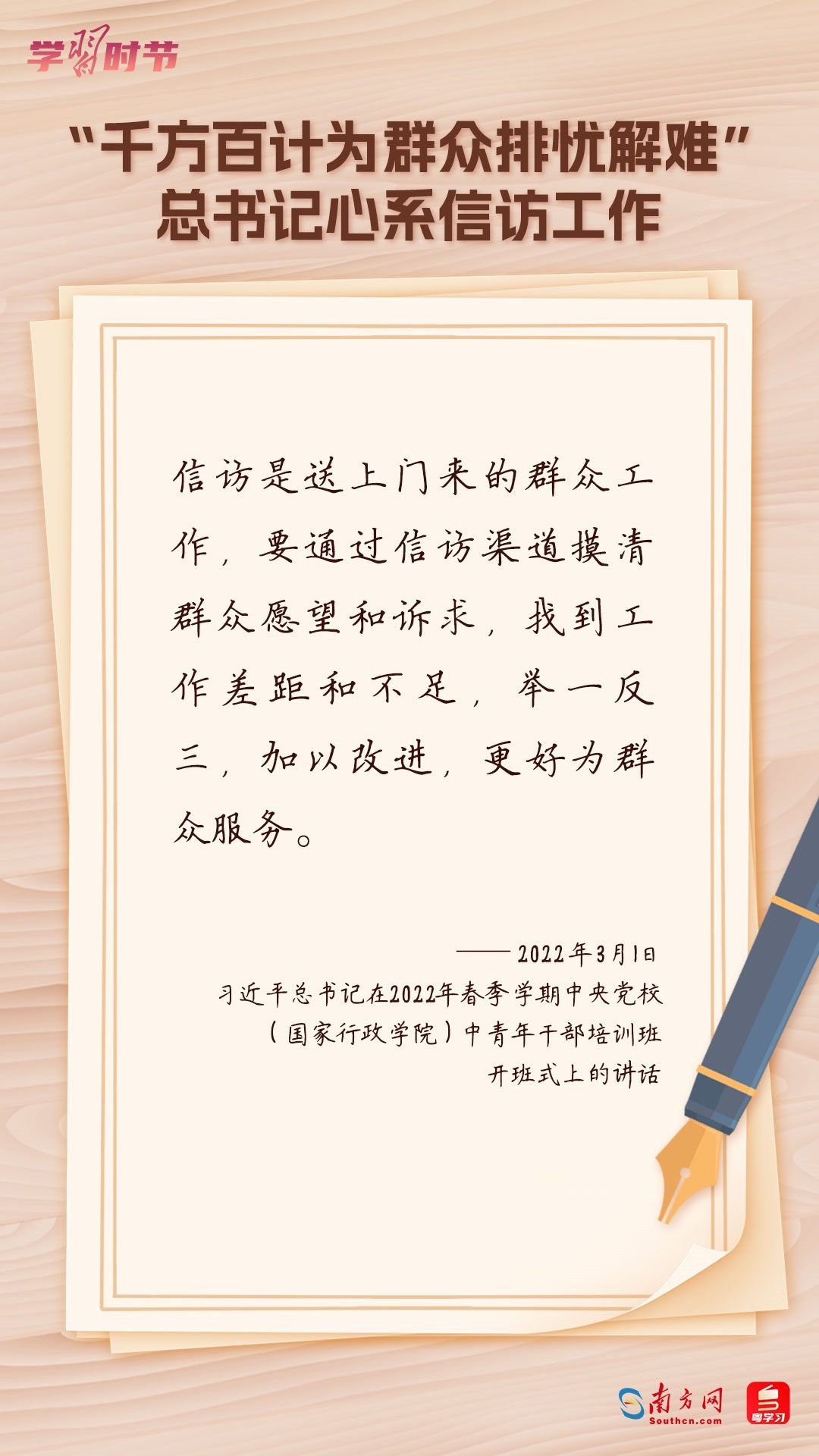 2022年5月1日,中共中央、國(guó)務(wù)院印發(fā)的《信訪工作條例》正式實(shí)施?!缎旁L工作條例》以習(xí)近平新時(shí)代中國(guó)特色社會(huì)主義思想為指導(dǎo),深入貫徹習(xí)近平總書記關(guān)于加強(qiáng)和改進(jìn)人民信訪工作的重要思想,總結(jié)黨長(zhǎng)期以來(lái)領(lǐng)導(dǎo)和開展信訪工作經(jīng)驗(yàn)特別是黨的十八大以來(lái)信訪工作制度改革成果,堅(jiān)持和加強(qiáng)黨對(duì)信訪工作的全面領(lǐng)導(dǎo),理順信訪工作體制機(jī)制,是新時(shí)代信訪工作的基本遵循。今年5月1日是《信訪工作條例》實(shí)施一周年,“學(xué)習(xí)時(shí)節(jié)”整理摘錄習(xí)近平總書記關(guān)于信訪工作的重要講話和重要指示批示,與您一同學(xué)習(xí)。
