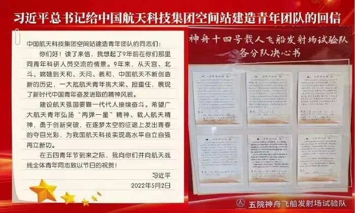 2022年5月2日,習(xí)近平總書記給中國航天科技集團(tuán)空間站建造青年團(tuán)隊回信,高度肯定航天青年,殷切期待青春奮斗。他強(qiáng)調(diào):“希望廣大航天青年弘揚‘兩彈一星’精神、載人航天精神,勇于創(chuàng)新突破,在逐夢太空的征途上發(fā)出青春的奪目光彩,為我國航天科技實現(xiàn)高水平自立自強(qiáng)再立新功。”一年來,五院人持續(xù)學(xué)習(xí)重溫、堅決貫徹落實習(xí)近平總書記重要回信精神和關(guān)于航天強(qiáng)國建設(shè)的重要指示批示精神,始終做到牢記囑托、感恩奮進(jìn),交出非凡“答卷”。