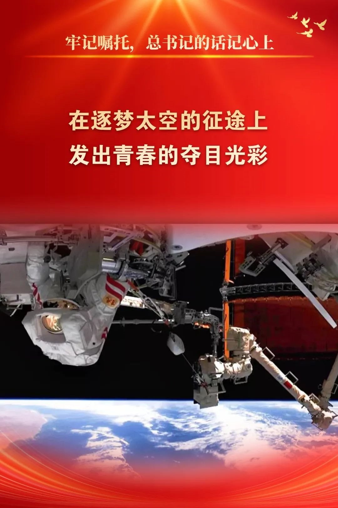 2013年5月4日,習(xí)近平總書記到航天科技集團(tuán)五院參加“實現(xiàn)中國夢、青春勇?lián)?dāng)”主題團(tuán)日活動時指出:“我們同青年朋友們到航天城來,就是要實地感受載人航天精神,激勵包括廣大青年在內(nèi)的全國各族人民為實現(xiàn)中華民族偉大復(fù)興的中國夢而奮斗?!笔陙恚逶喝耸冀K堅定沿著黨指引的方向前進(jìn),圓滿完成了以載人航天、探月探火、北斗導(dǎo)航等為代表的一系列航天重大工程任務(wù)。