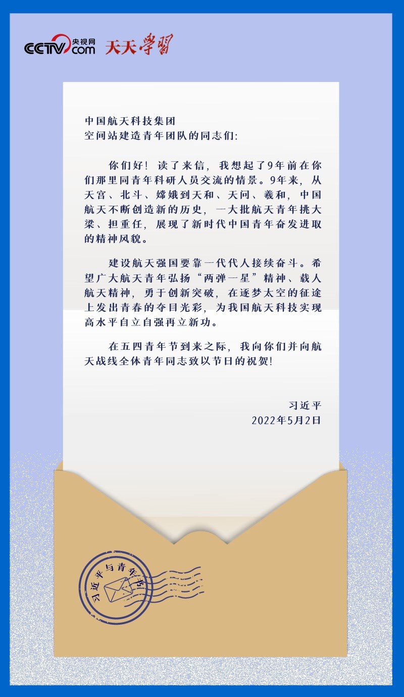 2022年5月2日,在五四青年節(jié)到來之際,中國航天科技集團(tuán)空間站建造青年團(tuán)隊(duì)收到了一份特別的節(jié)日禮物——一封落款為“習(xí)近平”的回信。