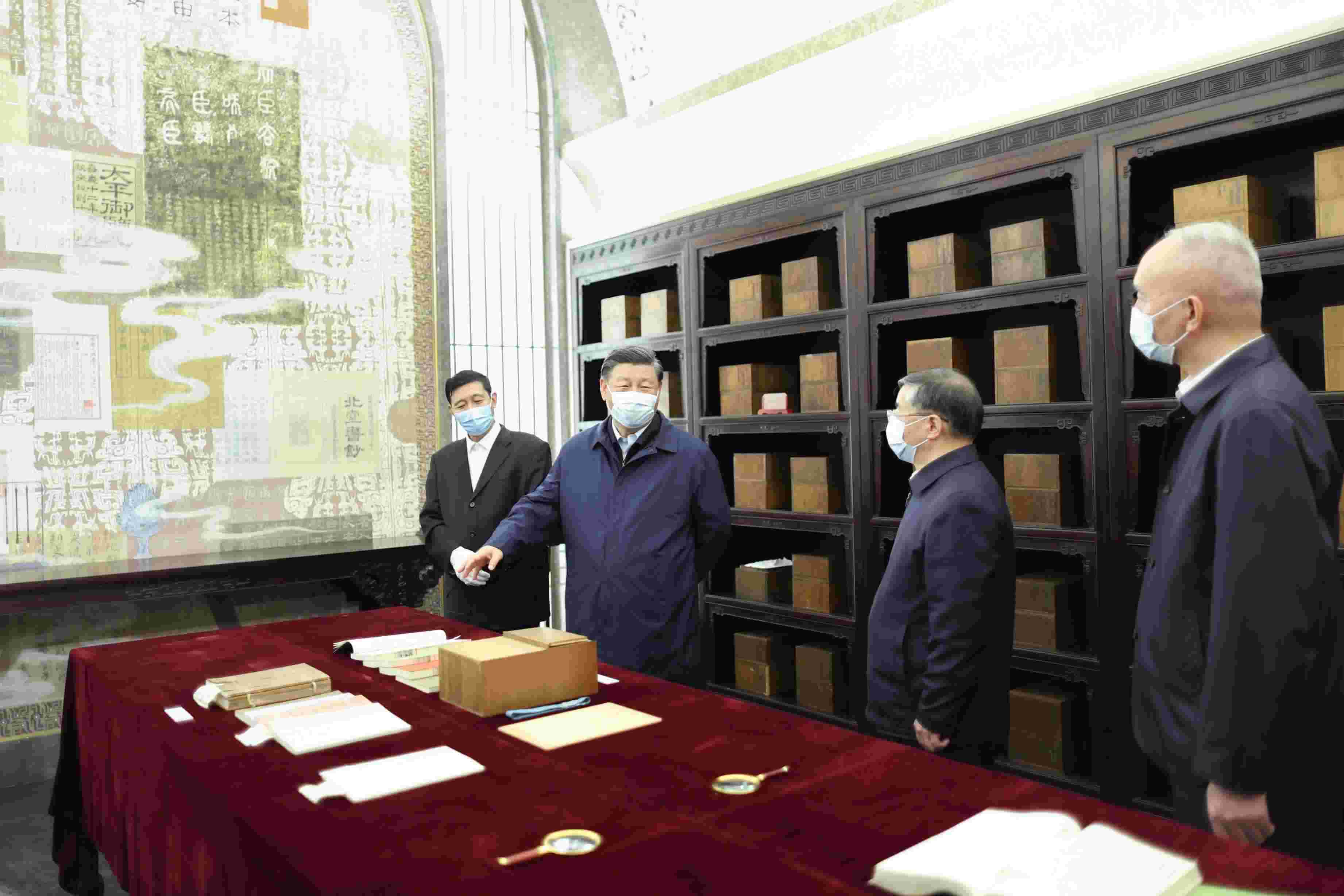 ▲6月1日下午,習近平總書記在中國國家版本館考察時,在蘭臺洞庫了解館藏精品版本保存情況。