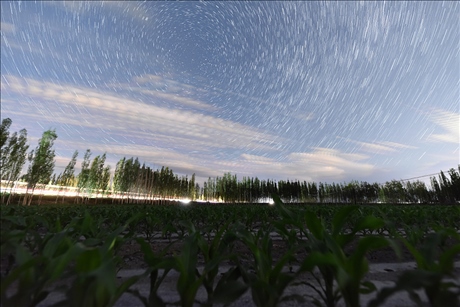 △新疆巴州和靜縣哈爾莫敦鎮(zhèn)查茨村高標準農田防護林的夏日星空夜景