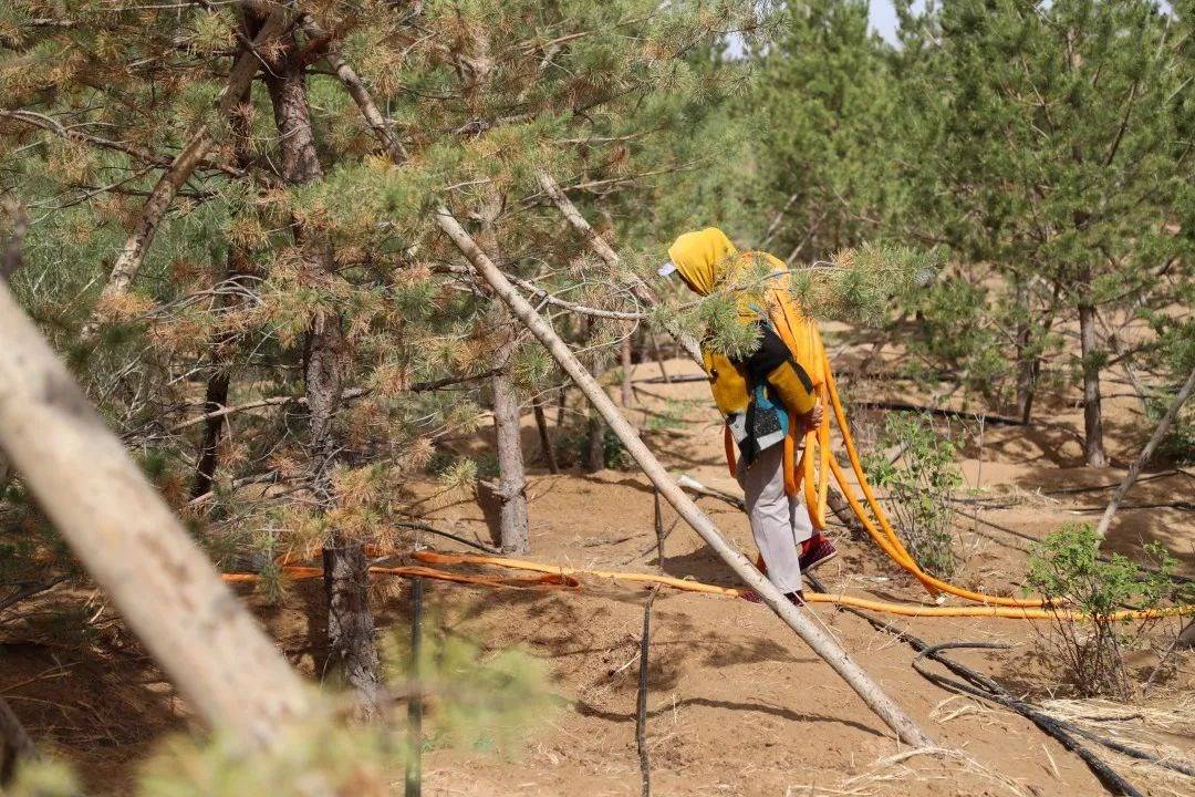 △2023年5月31日,治沙工人在庫布其沙漠億利生態(tài)治理區(qū)內搬運水管,準備為樹木澆水。