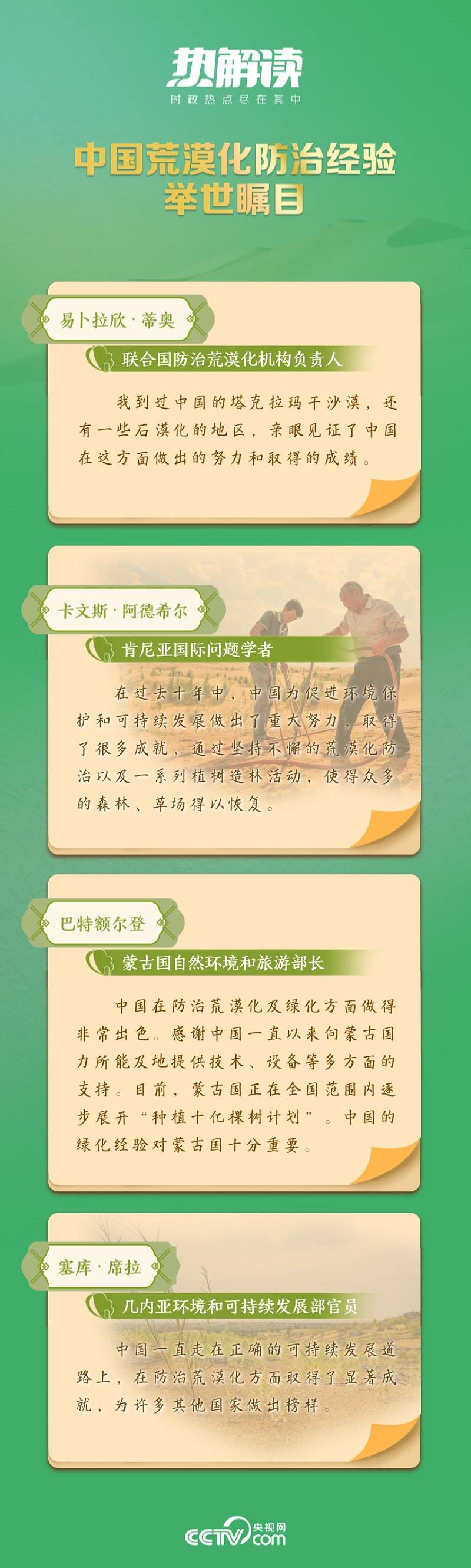 在6月6日召開的座談會(huì)上,總書記講到從“沙進(jìn)人退”到“綠進(jìn)沙退”的歷史性轉(zhuǎn)變,講到荒漠化區(qū)域經(jīng)濟(jì)社會(huì)發(fā)展和生態(tài)面貌發(fā)生了翻天覆地的變化,講到荒漠化和土地沙化實(shí)現(xiàn)“雙縮減”,講到防沙治沙法律法規(guī)體系日益健全……這些成績(jī),讓14億多中國人民都倍感榮光。