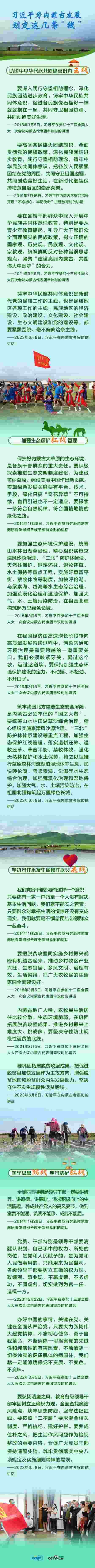 6月8日,習(xí)近平總書記聽取內(nèi)蒙古自治區(qū)黨委和政府工作匯報后發(fā)表講話,強調(diào)內(nèi)蒙古要“以鑄牢中華民族共同體意識為主線”,“加強生態(tài)保護紅線管理”,“堅決守住不發(fā)生規(guī)模性返貧底線”,“筑牢思想防線,堅守法紀紅線”。