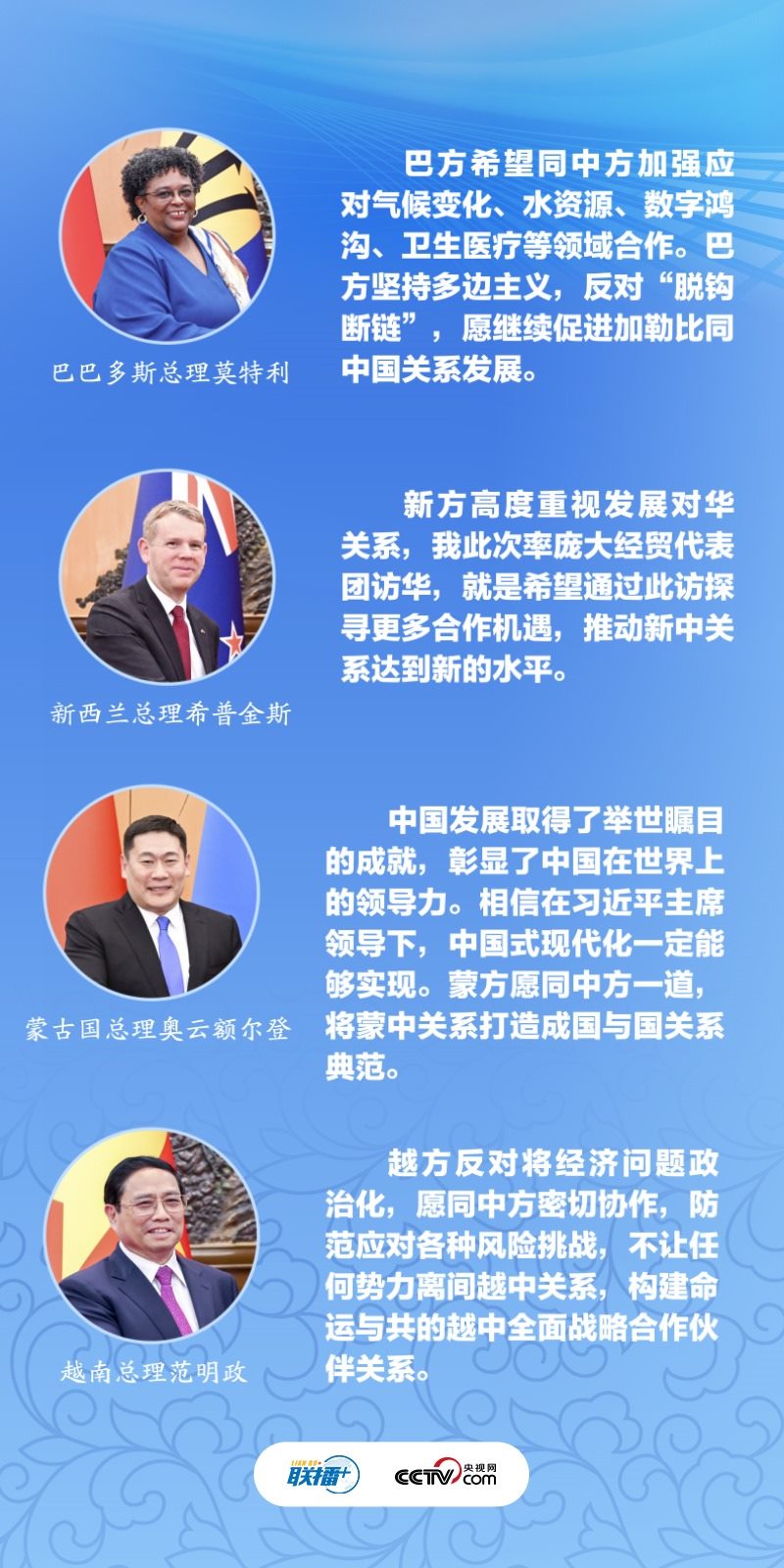 巴巴多斯總理莫特利直言“通過此訪深切感受到巴中之間的團結(jié)與友好”;蒙古國總理奧云額爾登希望“將蒙中關(guān)系打造成國與國關(guān)系典范”;越南總理范明政堅定表示“不讓任何勢力離間越中關(guān)系”;中新關(guān)系長期“領(lǐng)跑”中國同發(fā)達國家關(guān)系,新西蘭總理希普金斯希望此訪能進一步推動雙方合作……6月27日的四場雙邊會見中,幾位外方領(lǐng)導(dǎo)人不約而同對擴大加深雙邊合作充滿信心。