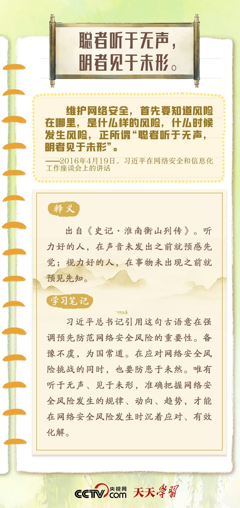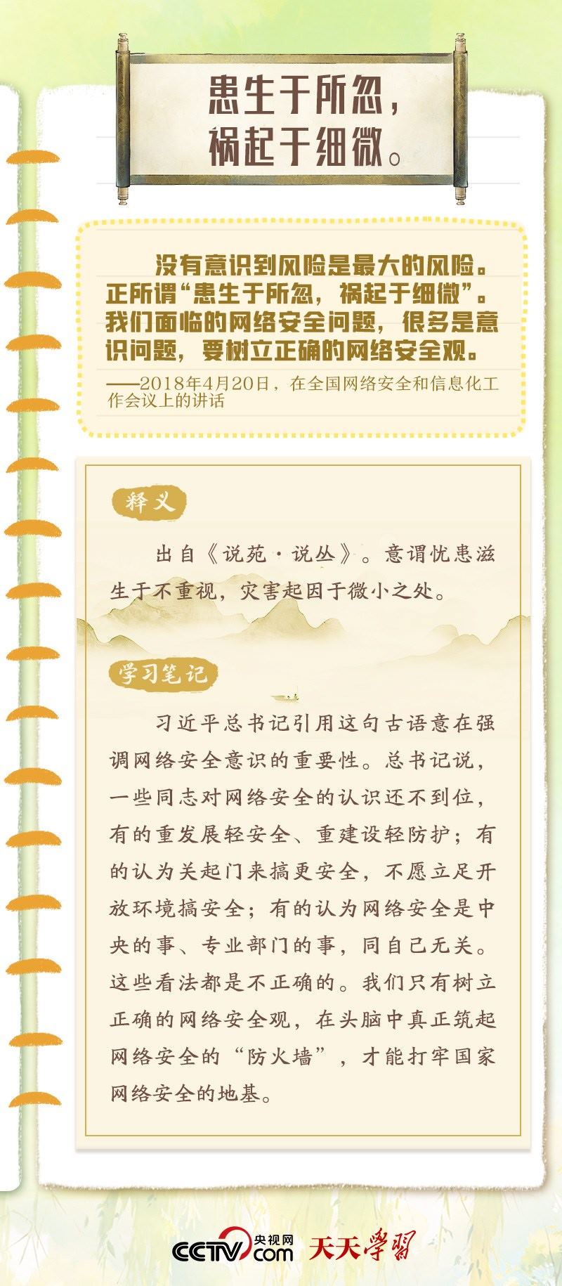 習(xí)近平總書(shū)記重視網(wǎng)絡(luò)安全工作,曾多次在講話中以典明理,深刻闡釋網(wǎng)絡(luò)安全工作的重要意義。“網(wǎng)絡(luò)安全宣傳周”到來(lái)之際,央視網(wǎng)《天天學(xué)習(xí)》特梳理總書(shū)記關(guān)于網(wǎng)絡(luò)安全的用典,與您一起學(xué)習(xí)領(lǐng)悟。
