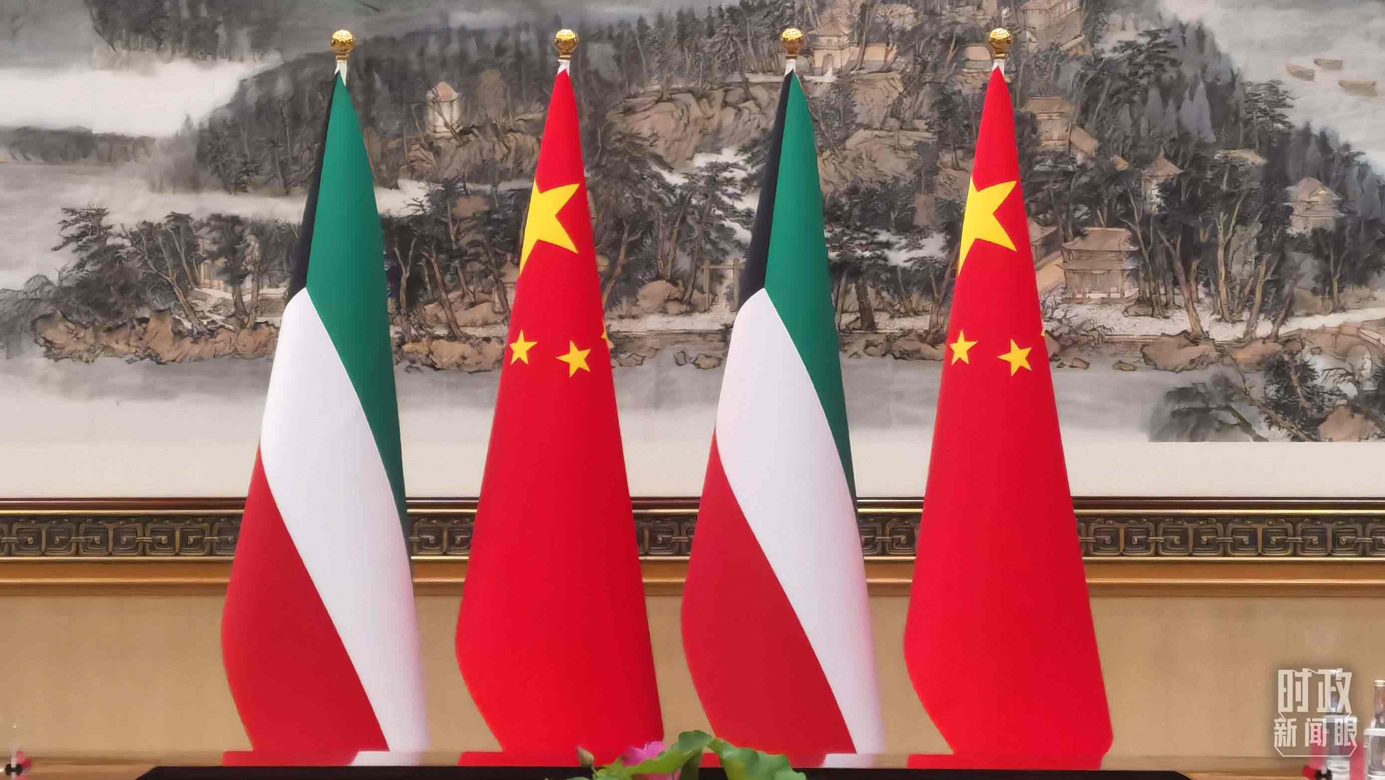 △會(huì)見(jiàn)現(xiàn)場(chǎng)擺放的中國(guó)、科威特國(guó)旗。(總臺(tái)央視記者曹亞星拍攝)