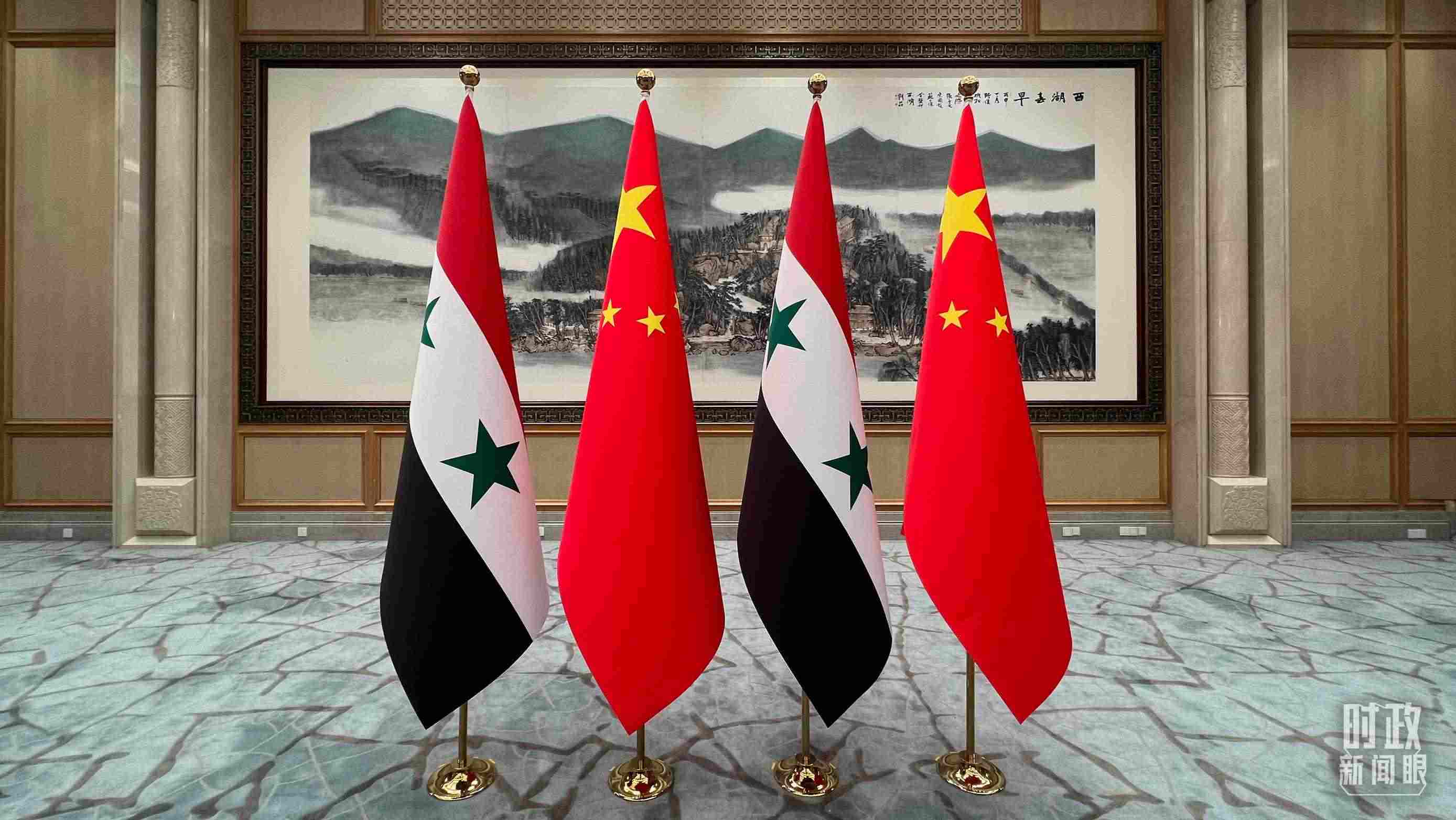△會(huì)見(jiàn)現(xiàn)場(chǎng)擺放的中國(guó)、敘利亞國(guó)旗。(總臺(tái)央視記者程鋮拍攝)