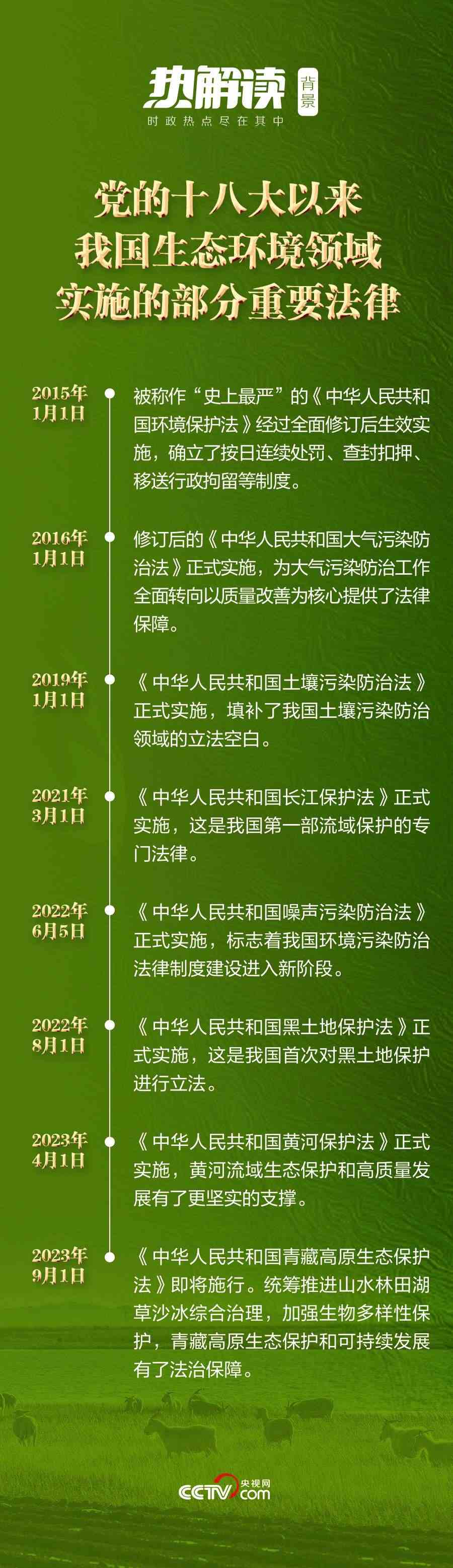 黨的十八大以來,越織越密的生態(tài)文明制度體系成為生態(tài)文明建設(shè)的有力保障。將“生態(tài)文明建設(shè)”寫入憲法,制定和修改長(zhǎng)江保護(hù)法、土地管理法、森林法等,我國(guó)生態(tài)環(huán)境立法實(shí)現(xiàn)了從量到質(zhì)的全面提升。