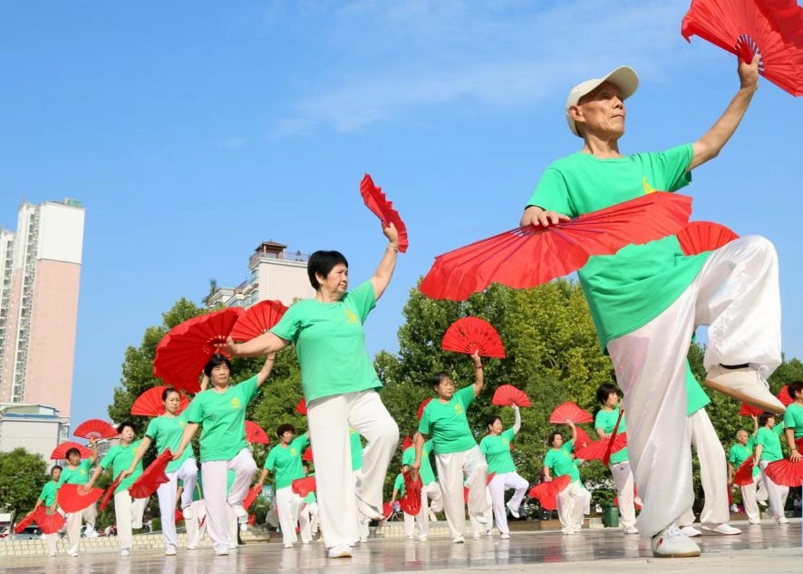 △2022年8月8日,在河南洛陽(yáng)市汝陽(yáng)縣,健身愛(ài)好者在表演太極蓮花雙扇。