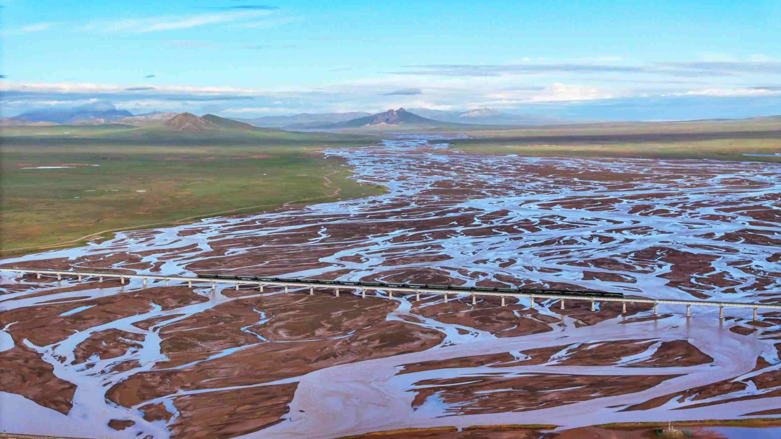 長江源特大橋全長1389.6米,是萬里長江源頭上的第一座鐵路橋,連通“天路”青藏鐵路。站在“長江源”石碑前眺望,大橋氣勢雄壯,如長虹飛跨沱沱河,橋上不時(shí)有火車疾馳而過。