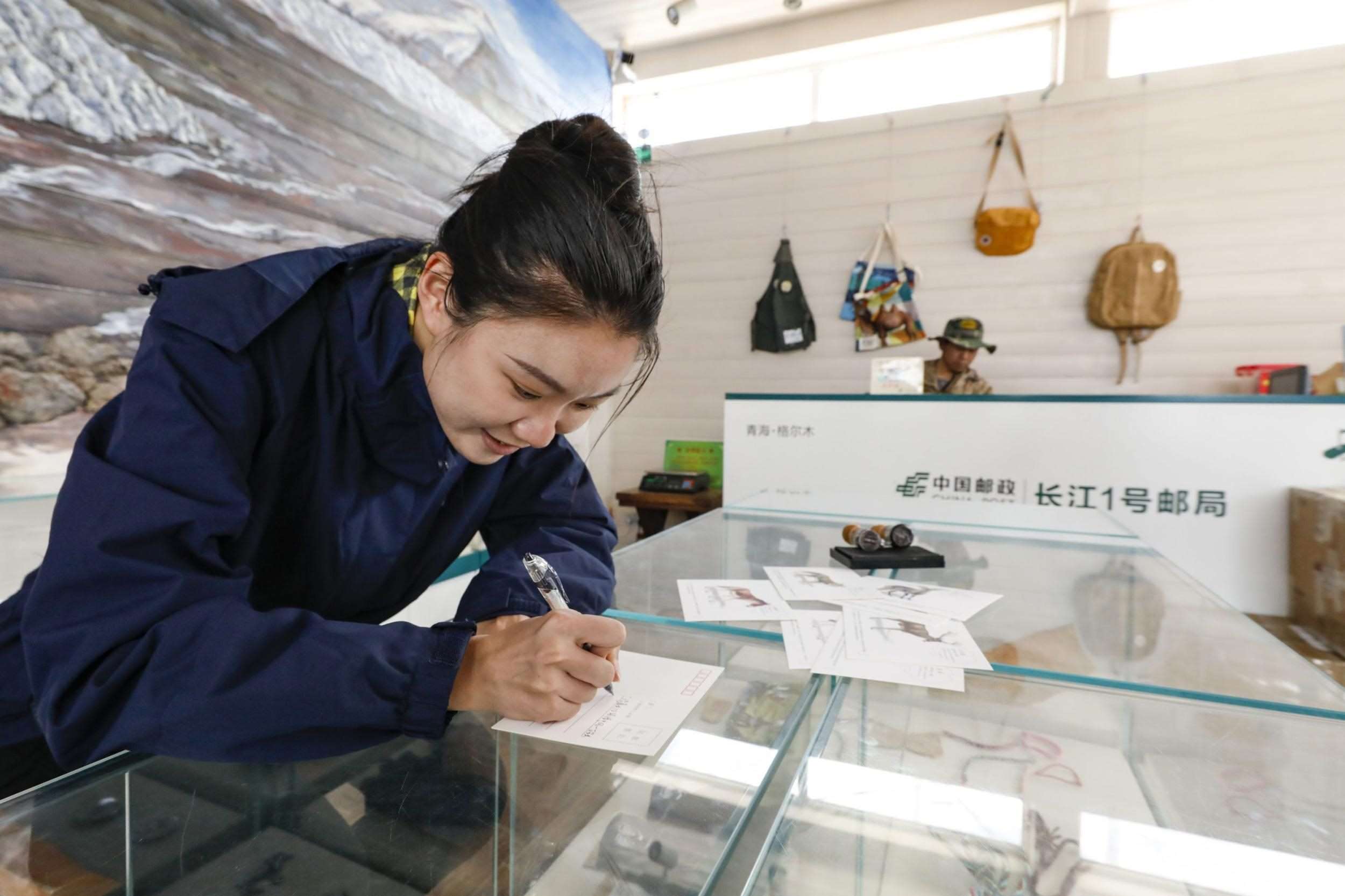 2023年7月23日,在“長江1號”郵局,一名女士郵寄長江生態(tài)保護(hù)主題明信片。王箏 攝