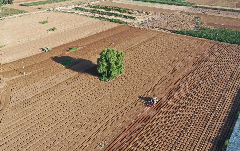 8月18日,在河北省涿州市刁窩鎮(zhèn)潘各莊村,農(nóng)民駕駛農(nóng)業(yè)機械進行復耕補種作業(yè)(無人機照片)。
