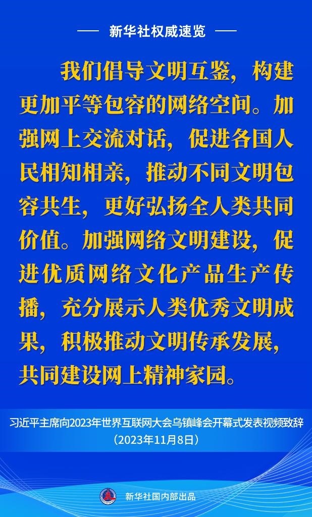 11月8日上午,國家主席習(xí)近平向2023年世界互聯(lián)網(wǎng)大會烏鎮(zhèn)峰會開幕式發(fā)表視頻致辭。一起來看金句。