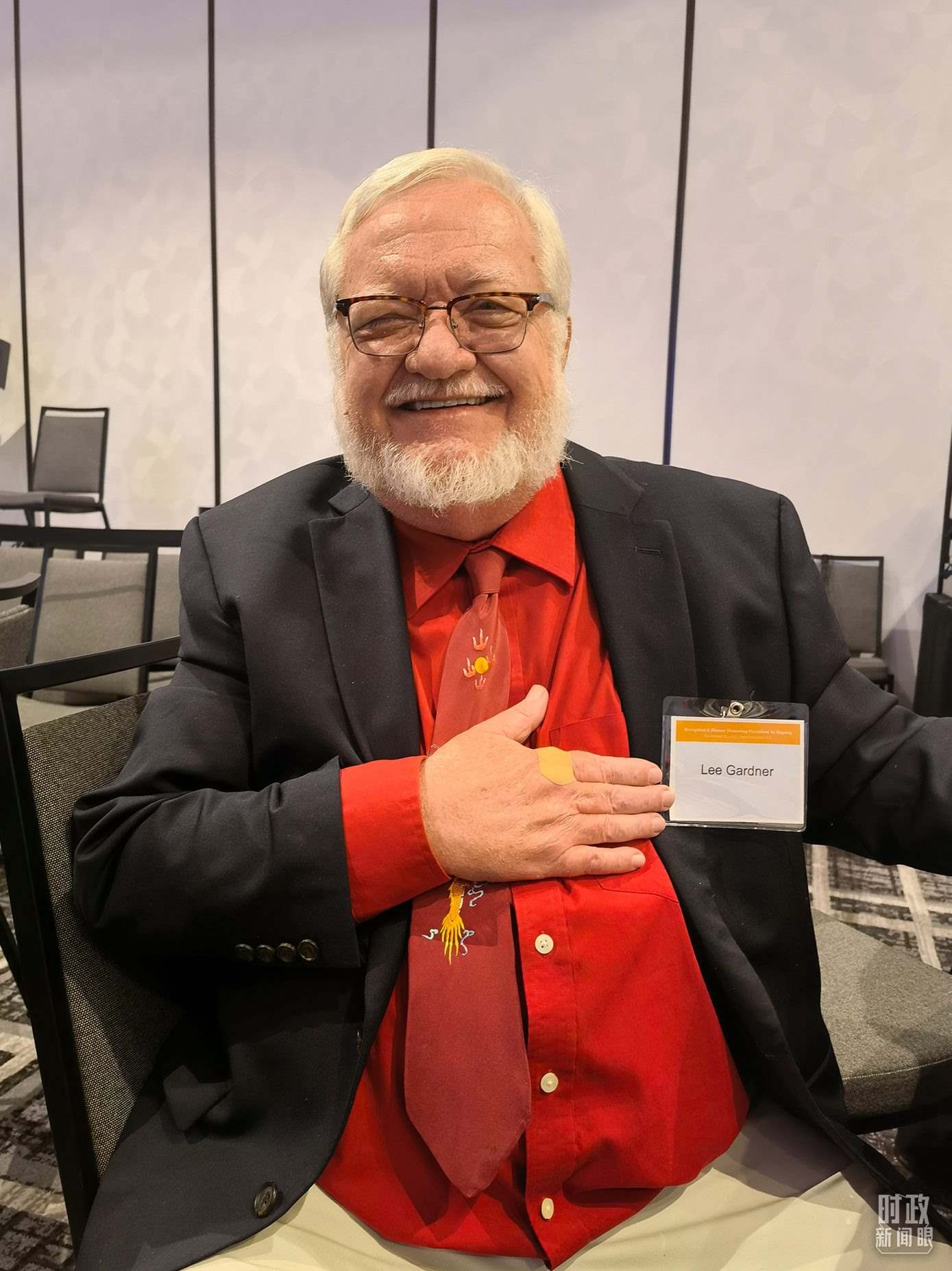 年逾70歲的李·加德納,是“鼓嶺故事”主人公密爾頓·加德納的侄孫。當天他特意佩戴了一條繡有“中國龍”的領帶。(總臺央視記者石丞、國廣記者李晉拍攝)