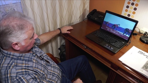 (▲弗拉基米爾·沃羅比約夫觀看由他創(chuàng)作的以北京冬奧會(huì)為主題的俄語歌曲《北京》)