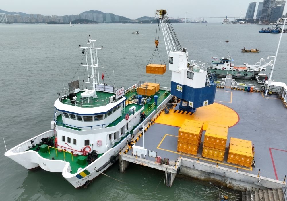 2024年1月25日,工作人員在廈門西堤海上環(huán)衛(wèi)碼頭吊運海漂垃圾(無人機照片)。新華社記者 林善傳 攝