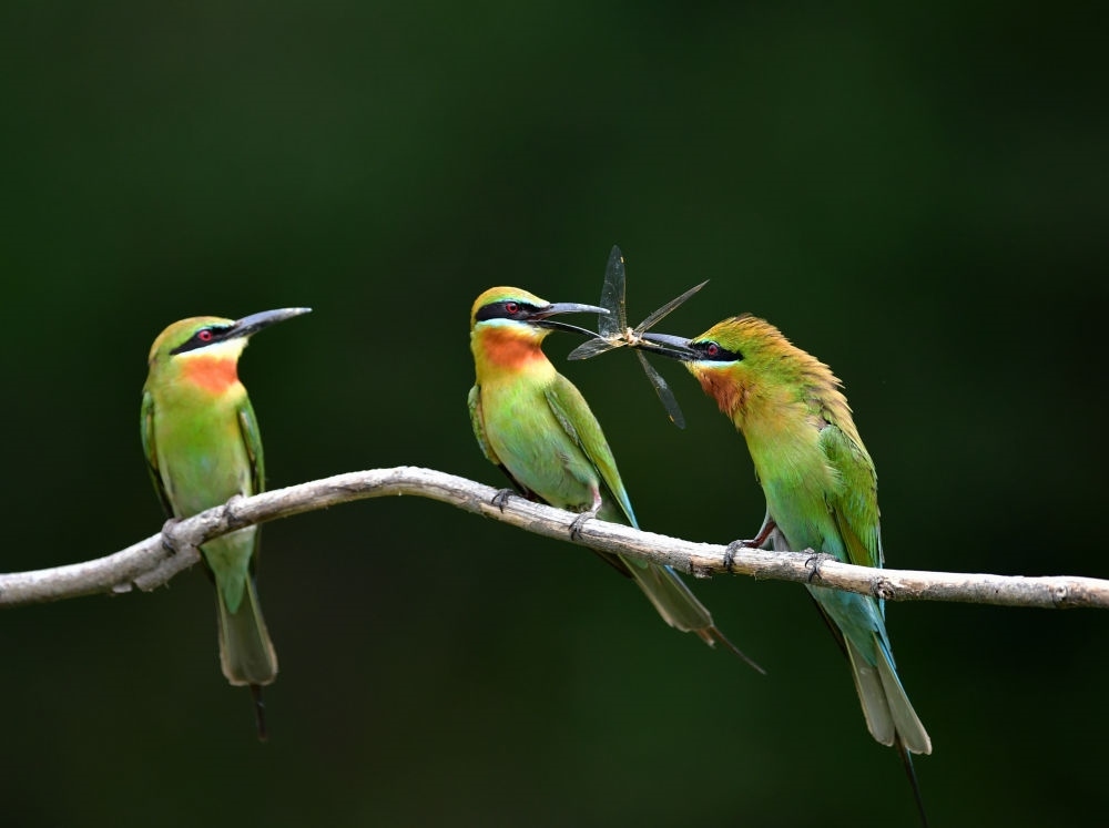 在廈門五緣灣栗喉蜂虎自然保護區(qū)騎馬山片區(qū),一只栗喉蜂虎雄鳥(右)給兩只雌鳥喂食昆蟲(2023年5月20日攝)。新華社記者 魏培全 攝