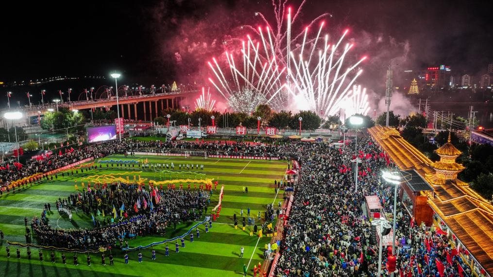 2月3日,音樂煙花秀在榕江縣舉辦的貴州“村超村晚”上演(無人機照片)。新華社記者劉續(xù) 攝