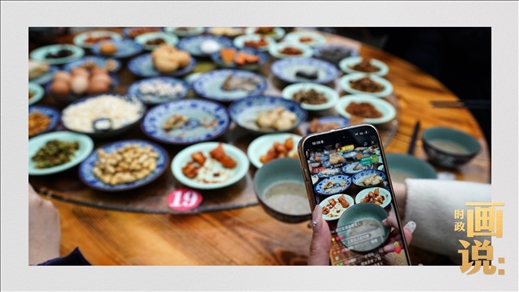 △游客用鏡頭記錄下豐盛的擂茶“壓桌菜”。2009年,擂茶習俗列入第三批“湖南省非物質文化遺產(chǎn)代表性項目名錄”。