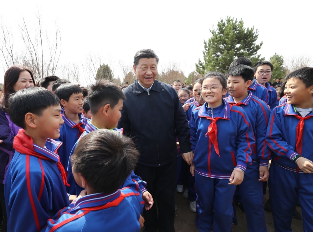 2019年4月8日,習(xí)近平等黨和國(guó)家領(lǐng)導(dǎo)人來(lái)到北京市通州區(qū)永順鎮(zhèn)參加首都義務(wù)植樹(shù)活動(dòng)。這是習(xí)近平同少先隊(duì)員在一起。
