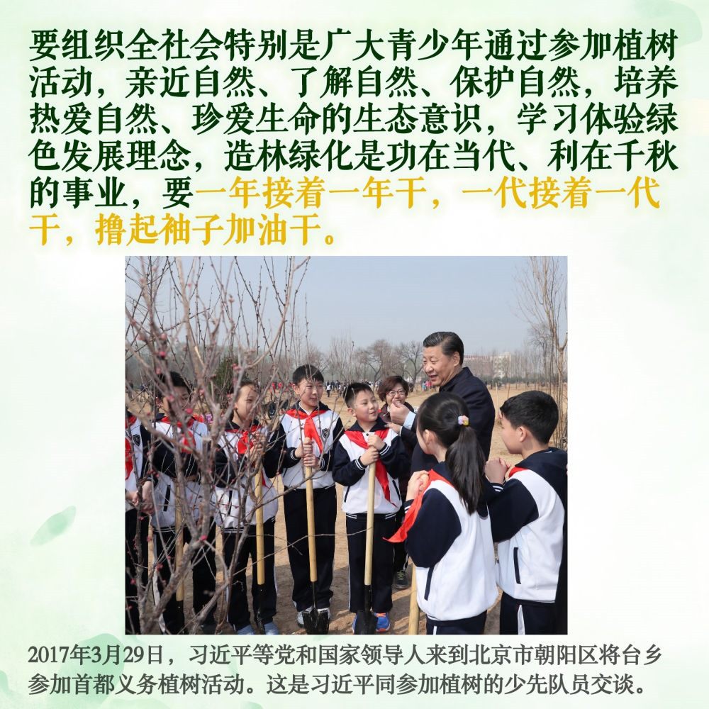 十年樹(shù)木,百年樹(shù)人。除去2020年因疫情防控考慮,每年植樹(shù)時(shí),習(xí)總書(shū)記都要和少年兒童一起,培土澆水、談心交流。好好學(xué)習(xí),鍛煉身體,熱愛(ài)勞動(dòng),愛(ài)護(hù)環(huán)境,德智體美勞全面發(fā)展,長(zhǎng)大后成為建設(shè)祖國(guó)的棟梁之才……習(xí)爺爺?shù)囊笠髧谕泻拖<剑?lì)著新時(shí)代少年兒童奮發(fā)有為、向陽(yáng)成長(zhǎng)。