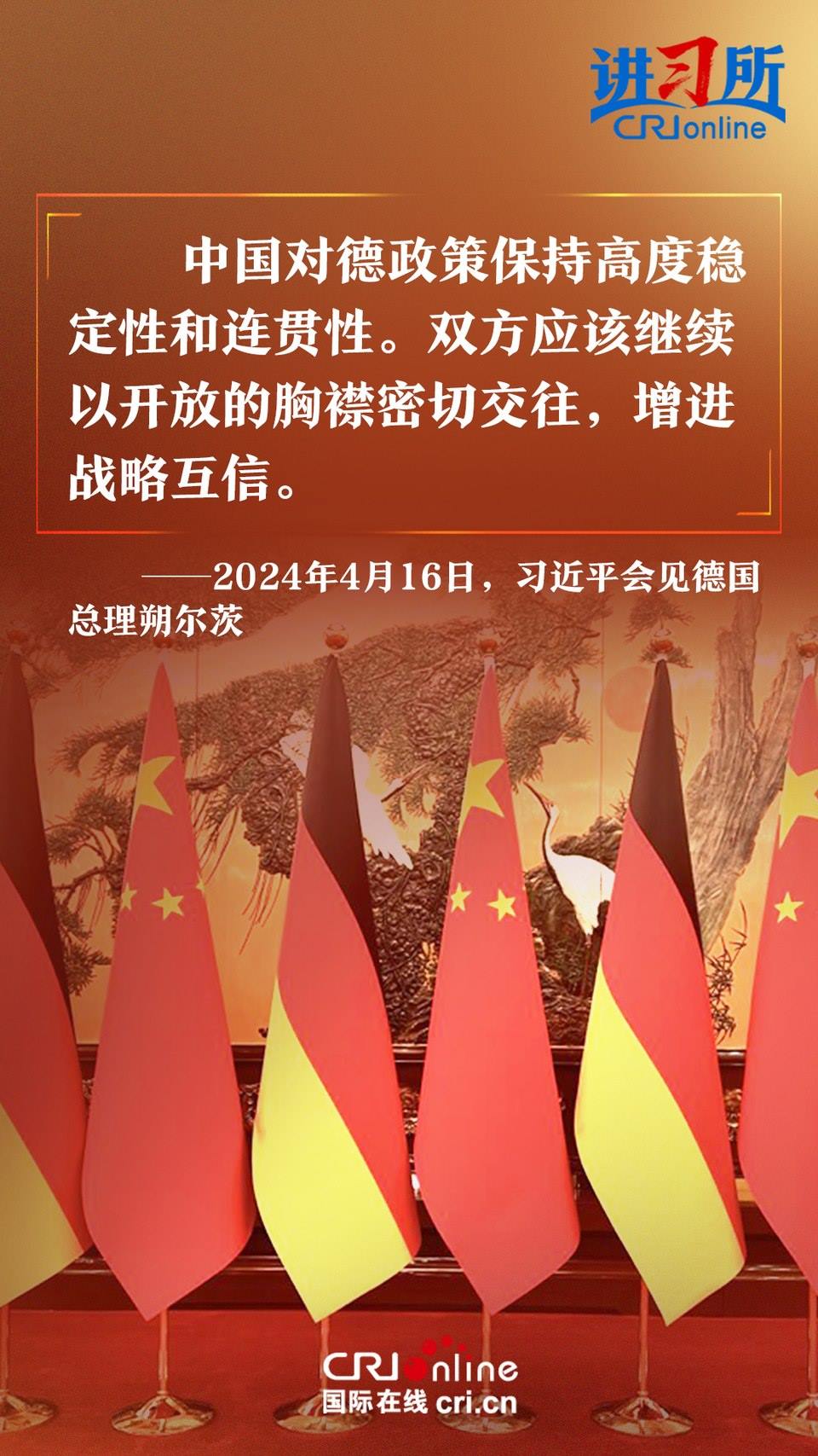 4月16日上午,中國(guó)國(guó)家主席習(xí)近平在北京釣魚臺(tái)國(guó)賓館會(huì)見了德國(guó)總理朔爾茨。習(xí)近平指出,中德合作對(duì)雙方有利,對(duì)世界有利。世界越是動(dòng)蕩,雙方越要提升兩國(guó)關(guān)系的韌性和活力。中德是世界第二、第三大經(jīng)濟(jì)體,鞏固和發(fā)展中德關(guān)系的意義超越雙邊關(guān)系范疇,對(duì)亞歐大陸乃至整個(gè)世界都有重要影響。兩國(guó)要從長(zhǎng)遠(yuǎn)和戰(zhàn)略角度看待和發(fā)展雙邊關(guān)系,攜手為世界注入更多穩(wěn)定性和確定性。