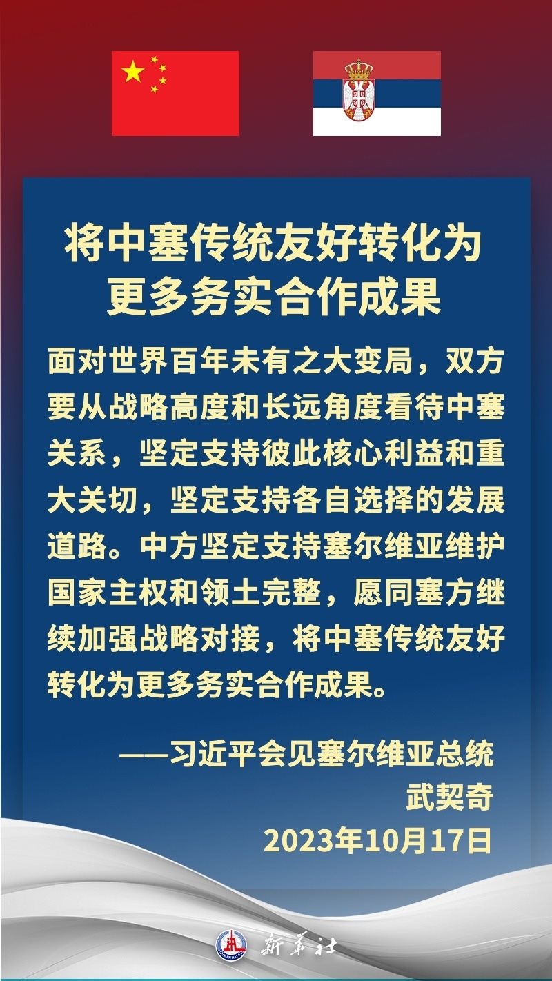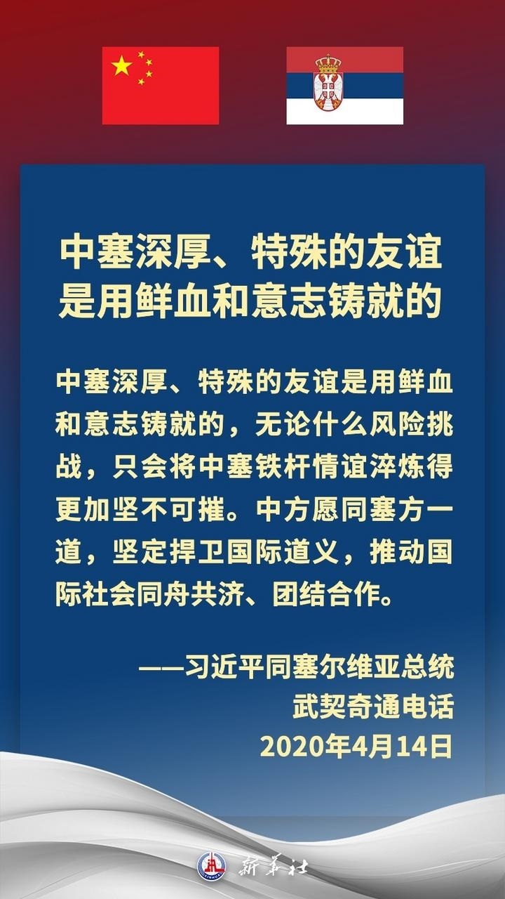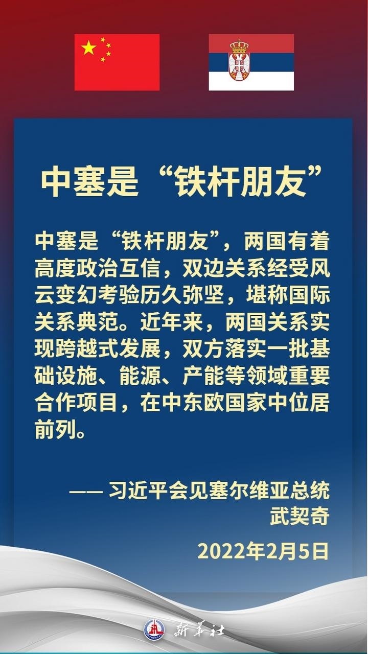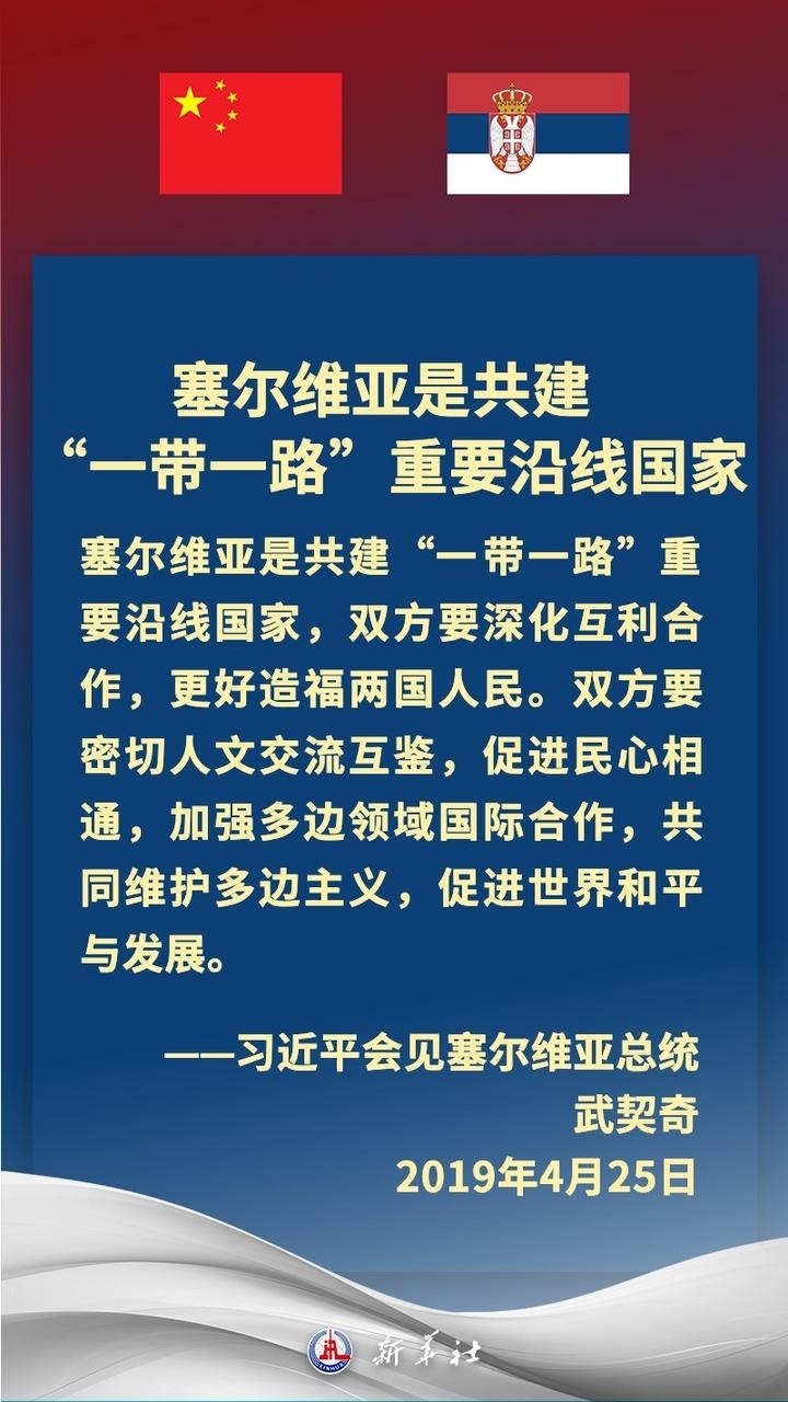 塞爾維亞是中國在中東歐地區(qū)首個全面戰(zhàn)略伙伴。近年來,在習(xí)近平主席和武契奇總統(tǒng)戰(zhàn)略引領(lǐng)下,中塞關(guān)系保持高水平運(yùn)行,雙方堅定支持彼此核心利益和重大關(guān)切,兩國政治互信牢固,高質(zhì)量共建“一帶一路”取得豐碩成果,在多邊領(lǐng)域協(xié)調(diào)緊密。習(xí)近平主席多次在重要場合提及,中國和塞爾維亞是“鐵桿朋友”。