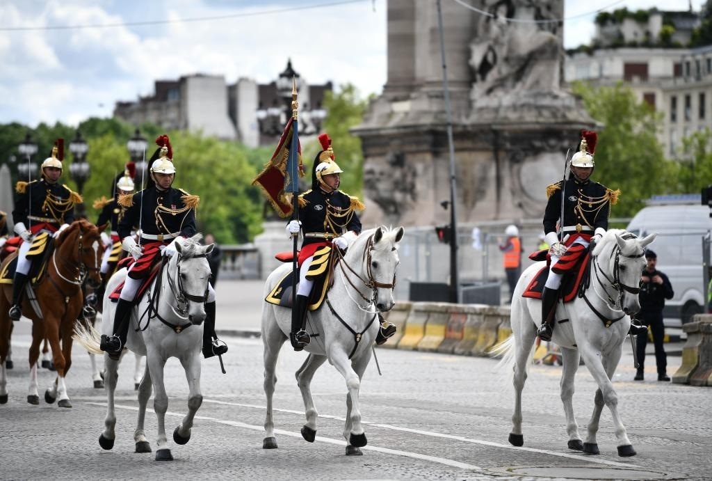 歡迎儀式后,習(xí)近平和夫人彭麗媛在共和國(guó)衛(wèi)隊(duì)148名騎兵組成的禮兵馬隊(duì)和摩托車(chē)隊(duì)護(hù)衛(wèi)下,乘車(chē)前往愛(ài)麗舍宮。