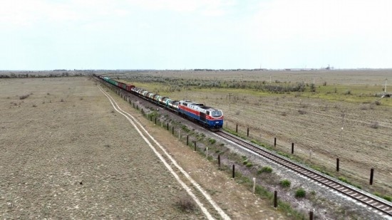 2023年5月12日,在哈薩克斯坦阿拉木圖附近,貨運(yùn)列車馳騁于阿拉木圖與中國霍爾果斯間(無人機(jī)照片)。新華社發(fā)(奧斯帕諾夫攝)