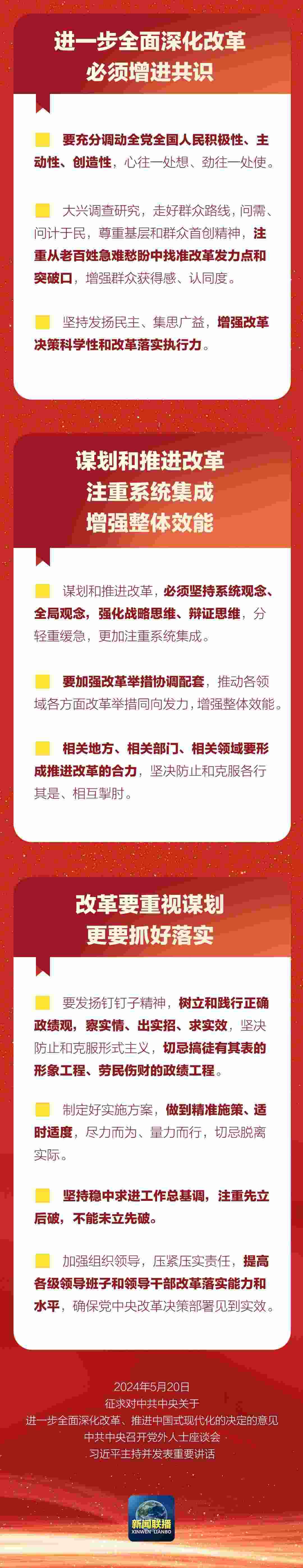 中共中央5月20日在中南海召開黨外人士座談會,就中共中央關(guān)于進(jìn)一步全面深化改革、推進(jìn)中國式現(xiàn)代化的決定聽取各民主黨派中央、全國工商聯(lián)負(fù)責(zé)人和無黨派人士代表的意見建議。中共中央總書記習(xí)近平主持座談會并發(fā)表重要講話。