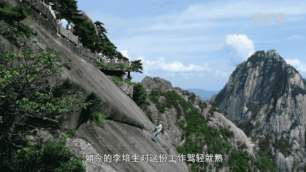 李培生在黃山景區(qū)從事環(huán)衛(wèi)保潔工作。他憑借一根繩索,在峭壁上“行走”自如,撿拾掉落的物品。