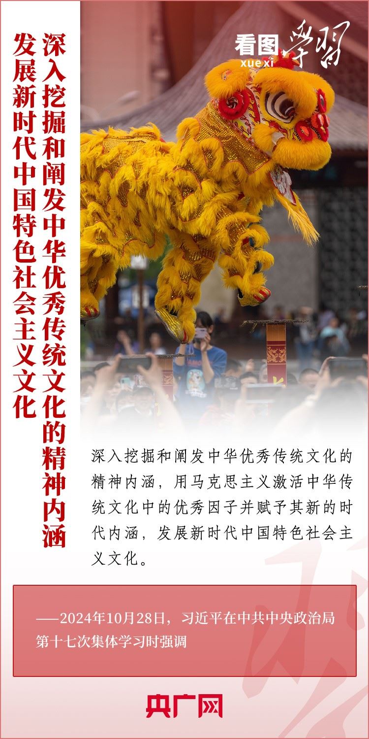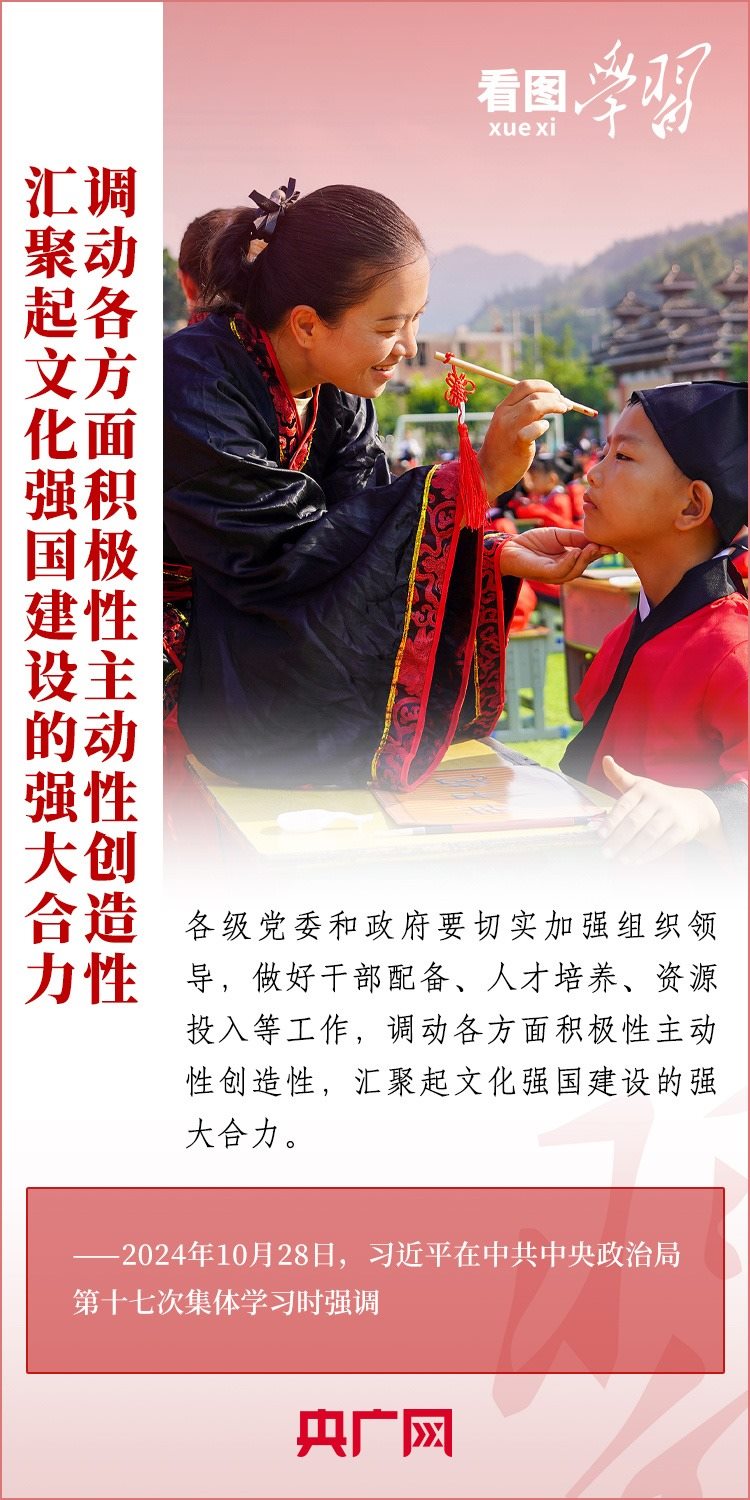 建設(shè)文化強(qiáng)國(guó)是全黨全社會(huì)的共同任務(wù)。10月28日,中共中央政治局就建設(shè)文化強(qiáng)國(guó)進(jìn)行第十七次集體學(xué)習(xí)。習(xí)近平總書記在聽(tīng)取講解和討論后發(fā)表重要講話,就錨定2035年建成文化強(qiáng)國(guó)戰(zhàn)略目標(biāo)作出最新部署,強(qiáng)調(diào)要“不斷發(fā)展具有強(qiáng)大思想引領(lǐng)力、精神凝聚力、價(jià)值感召力、國(guó)際影響力的新時(shí)代中國(guó)特色社會(huì)主義文化,不斷增強(qiáng)人民精神力量,筑牢強(qiáng)國(guó)建設(shè)、民族復(fù)興的文化根基?!币黄饋?lái)學(xué)習(xí)!