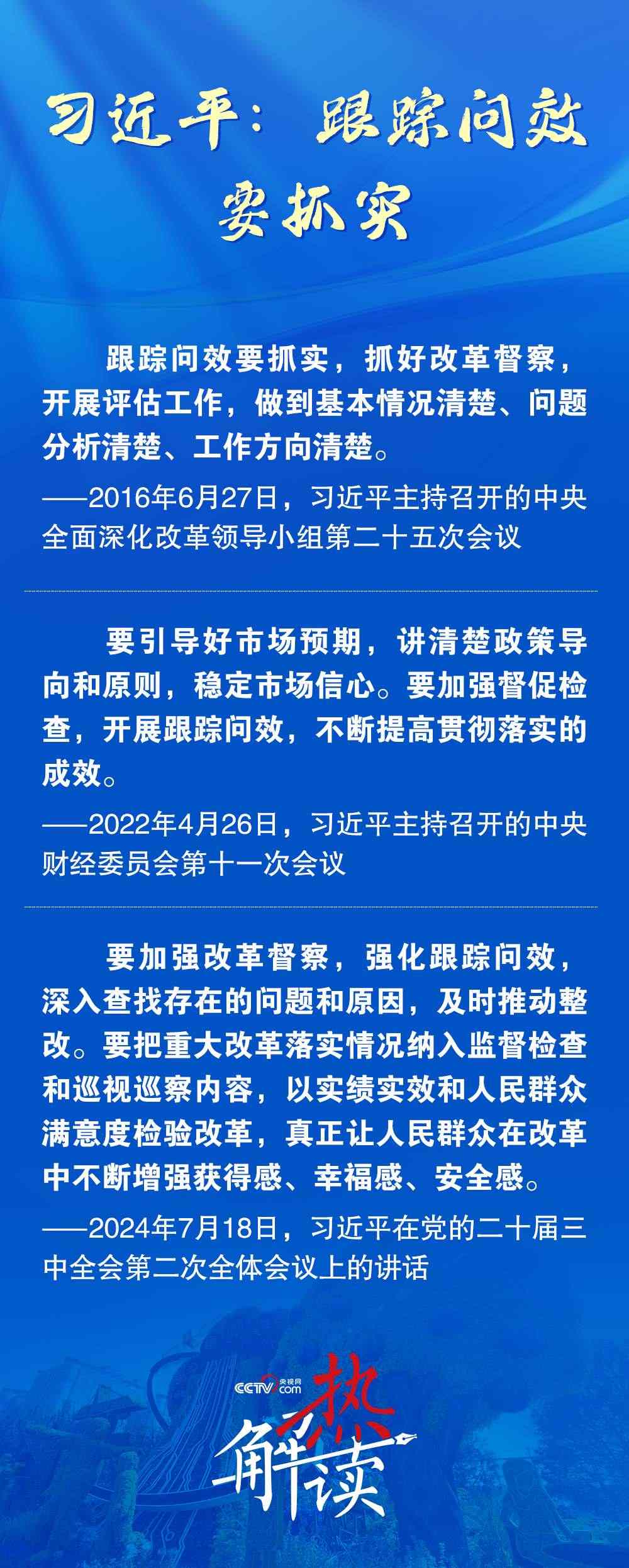今年7月,在黨的二十屆三中全會(huì)第二次全體會(huì)議上,習(xí)近平總書(shū)記進(jìn)一步提出,要強(qiáng)化跟蹤問(wèn)效,深入查找存在的問(wèn)題和原因,及時(shí)推動(dòng)整改。