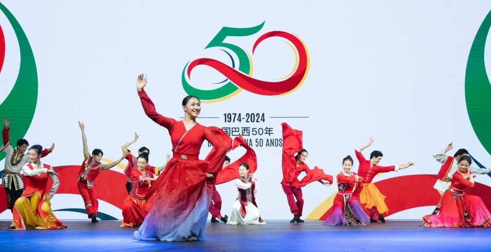 △當?shù)貢r間2024年8月15日,在巴西首都巴西利亞,來自北京舞蹈學院民族舞團的演員在慶祝中巴建交50周年招待會上表演。
