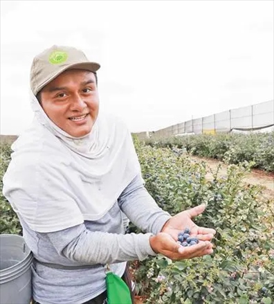 △在秘魯特魯希略市一家農(nóng)場里,采摘工人在展示剛摘下的藍(lán)莓。