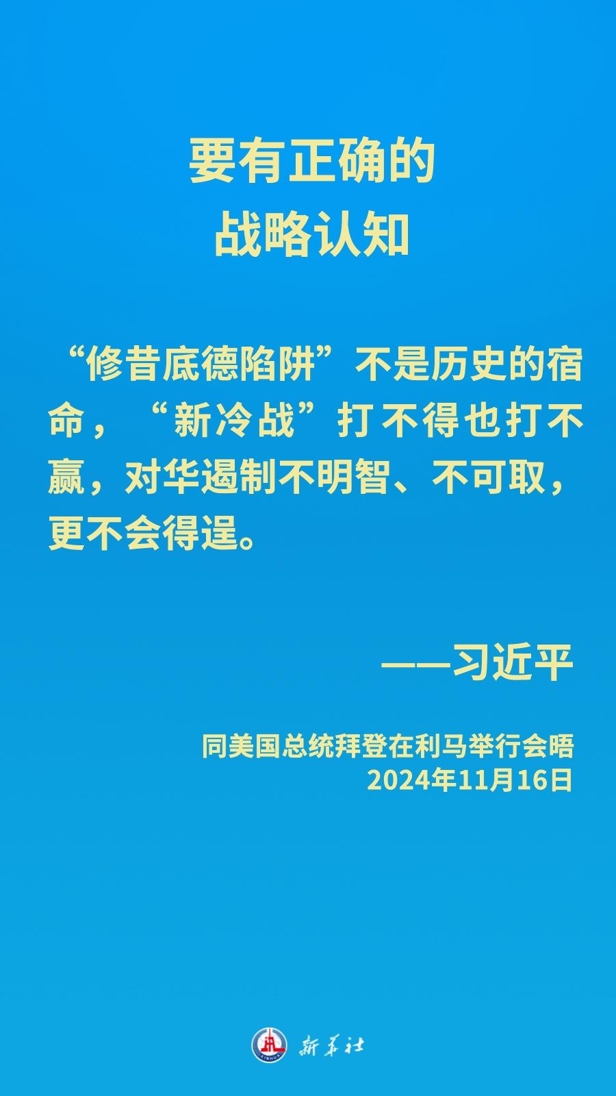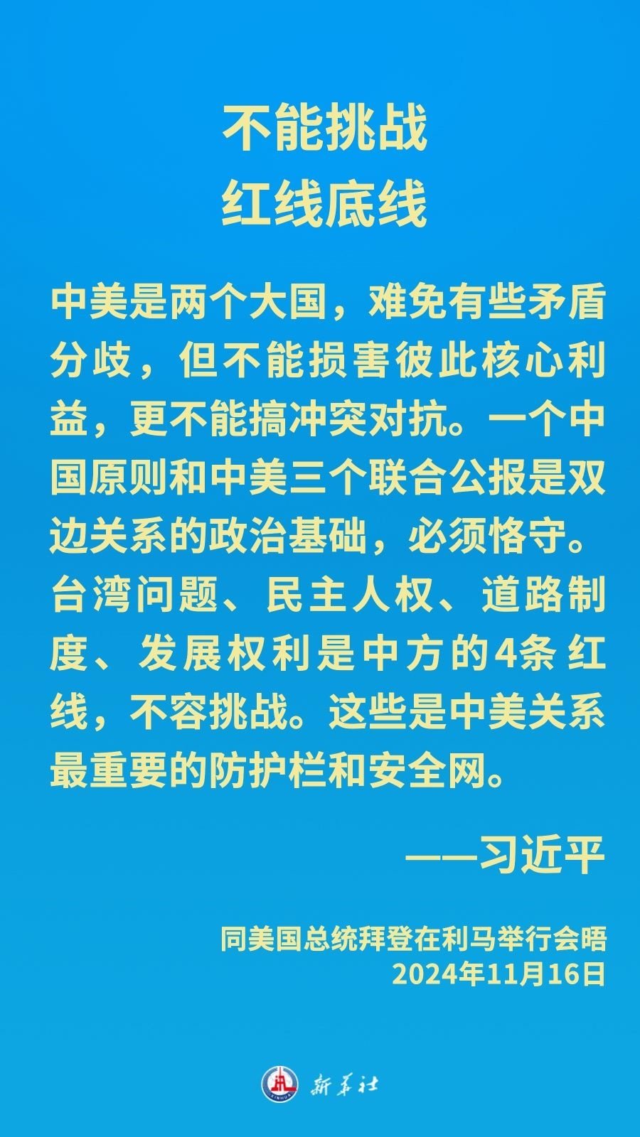 當(dāng)?shù)貢r(shí)間11月16日下午,習(xí)近平主席在秘魯利馬出席亞太經(jīng)合組織領(lǐng)導(dǎo)人非正式會(huì)議期間應(yīng)約同美國總統(tǒng)拜登舉行會(huì)晤。就中美關(guān)系發(fā)展,習(xí)近平主席闡明中方立場——