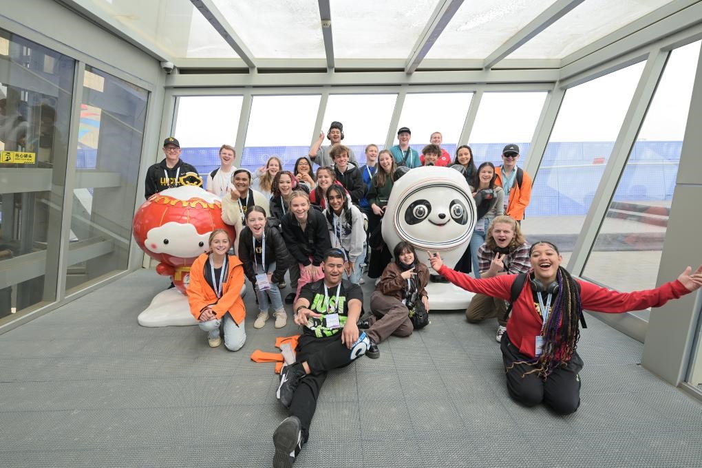 2024年3月21日,美國(guó)華盛頓州中學(xué)生代表團(tuán)的成員在首鋼滑雪大跳臺(tái)上與冰墩墩、雪容融合影。新華社記者 李鑫 攝