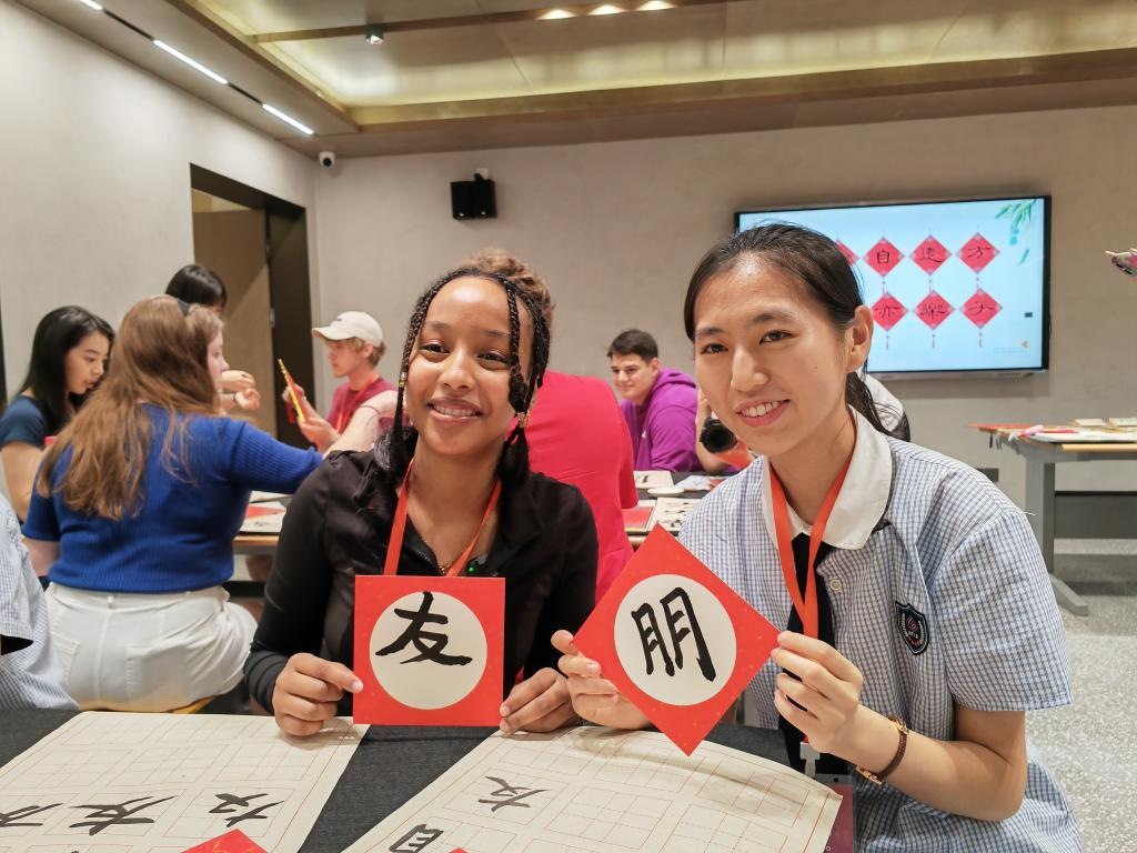 2024年6月8日,在河北省石家莊外國(guó)語(yǔ)學(xué)校,美國(guó)山谷高中學(xué)生娜斯拉(左一)在上漢字書法課。新華社記者 杜一方 攝