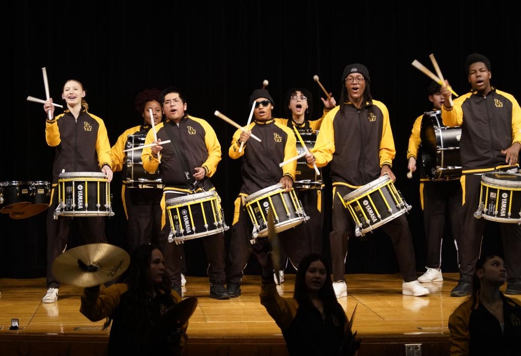 2024年1月30日,在美國(guó)華盛頓州林肯中學(xué),學(xué)校鼓樂(lè)隊(duì)在美國(guó)中學(xué)生赴華交流歡送儀式上表演。新華社記者 吳曉凌 攝