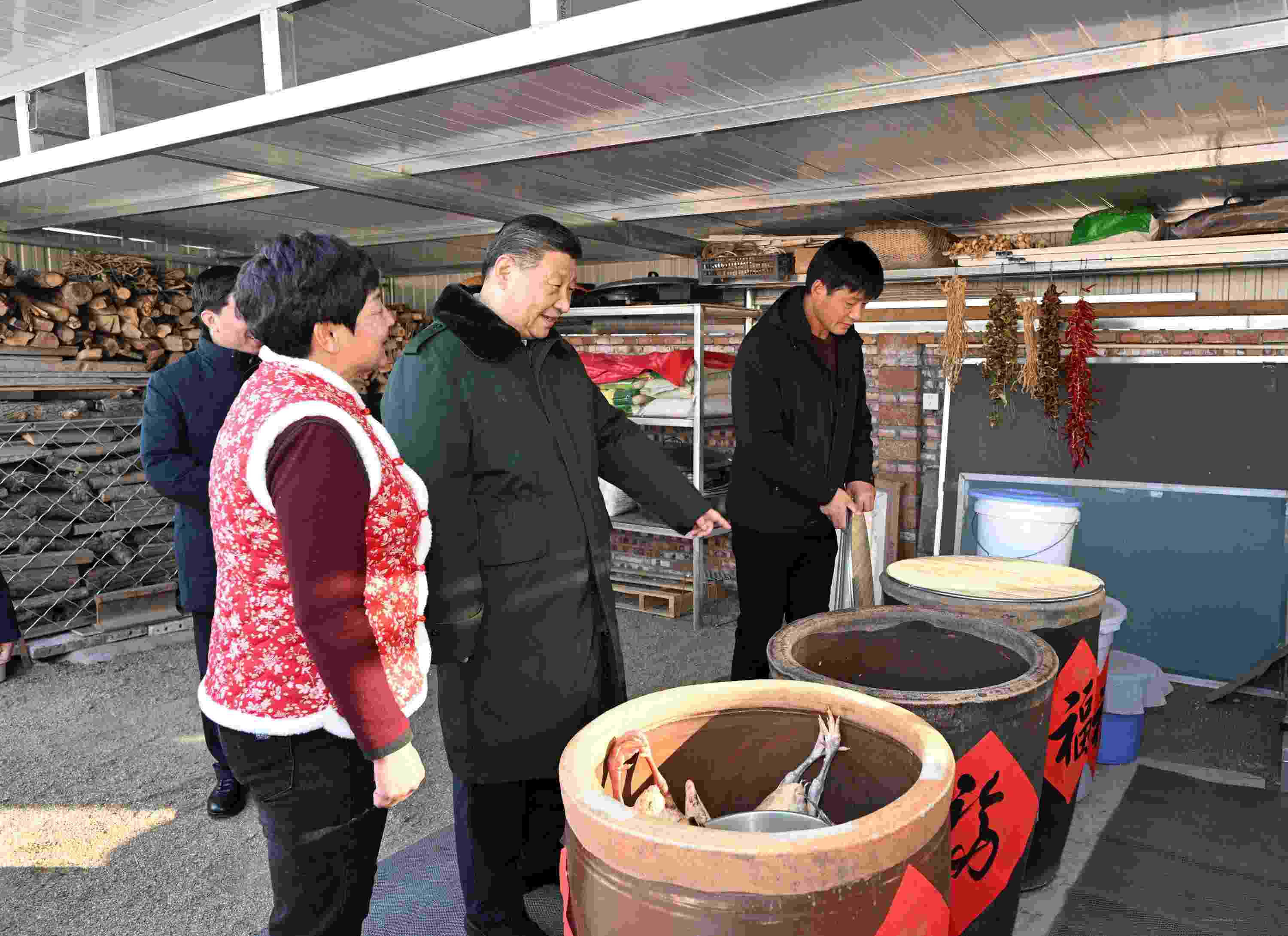 在村民師紅兵家,總書記掀開墻邊大缸的蓋子,一一觀瞧;轉(zhuǎn)到儲(chǔ)藏室、廚房等察看年貨,然后洗手加入霍州年饃的制作。
