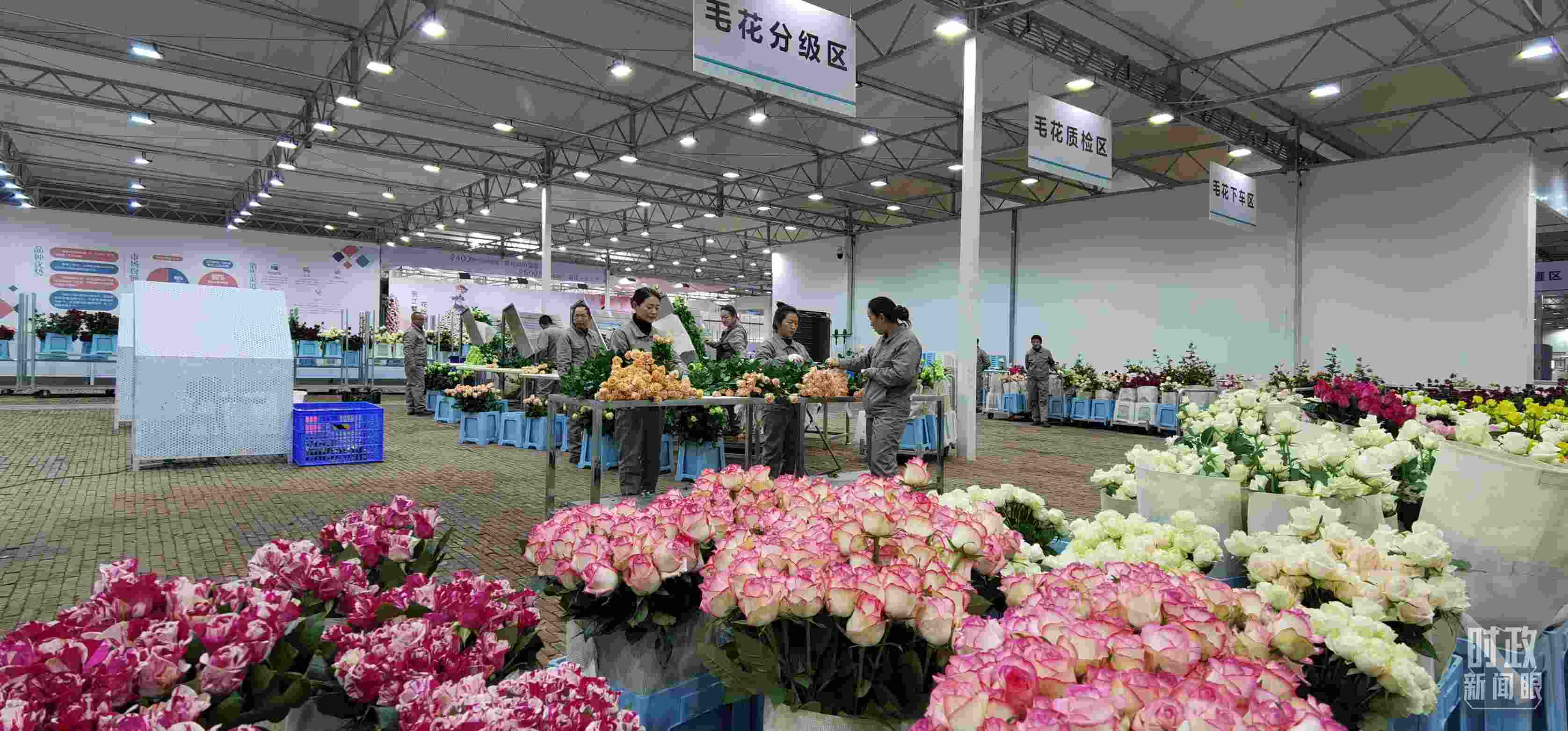 △麗江現(xiàn)代花卉產(chǎn)業(yè)園內(nèi),工人正在分類整理鮮花。(總臺(tái)央視記者郭鴻拍攝)