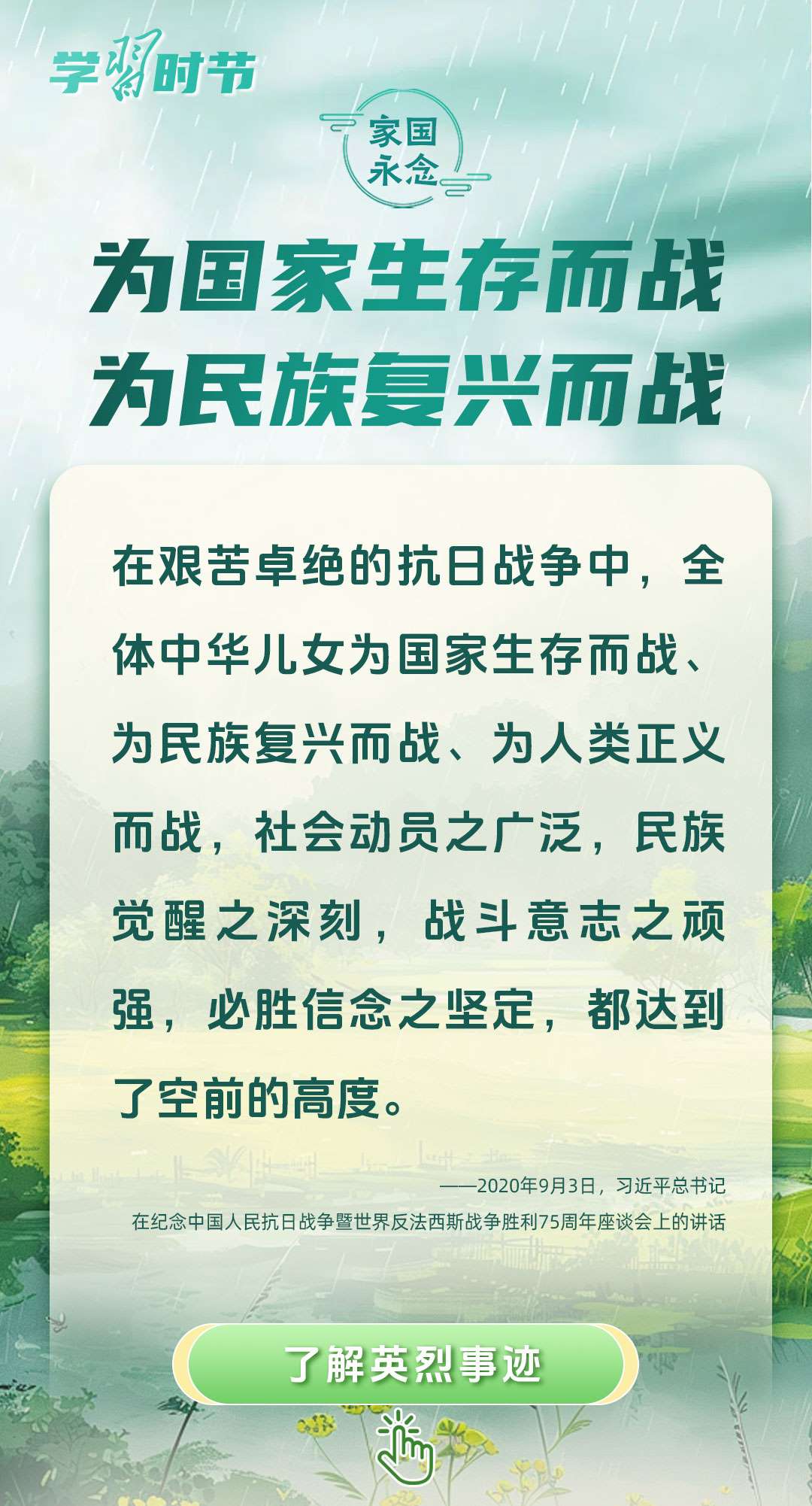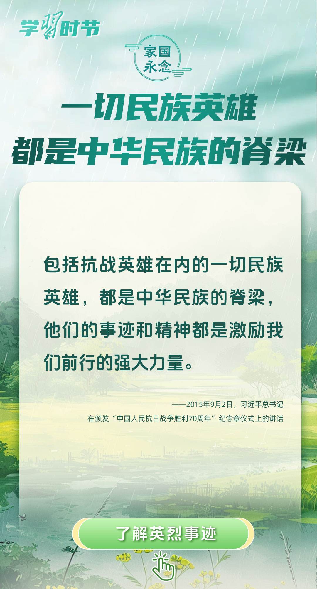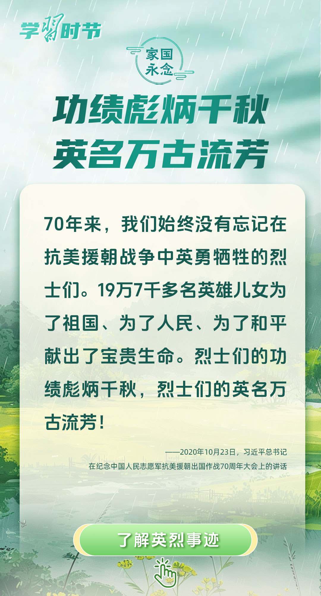 今年是中國(guó)人民抗日戰(zhàn)爭(zhēng)暨世界反法西斯戰(zhàn)爭(zhēng)勝利80周年、中國(guó)人民志愿軍抗美援朝出國(guó)作戰(zhàn)75周年。習(xí)近平總書記曾說:“對(duì)一切為國(guó)家、為民族、為和平付出寶貴生命的人們,不管時(shí)代怎樣變化,我們都要永遠(yuǎn)銘記他們的犧牲和奉獻(xiàn)。”今天我們所擁有的一切,無不凝結(jié)著英雄、英烈們的奉獻(xiàn)付出乃至巨大犧牲。