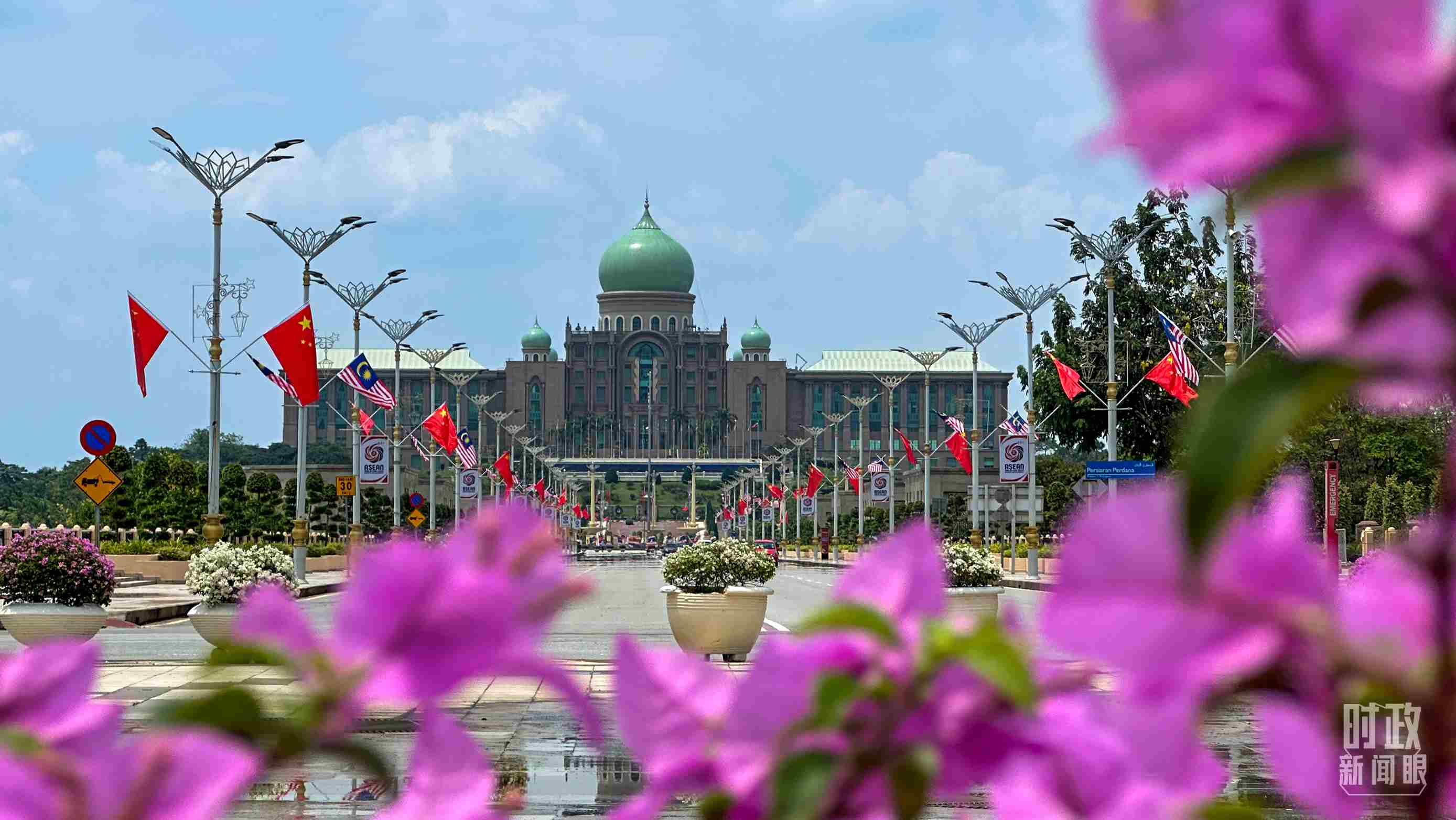 △馬來西亞總理府前懸掛的中馬兩國國旗。(總臺央視記者關舟拍攝)